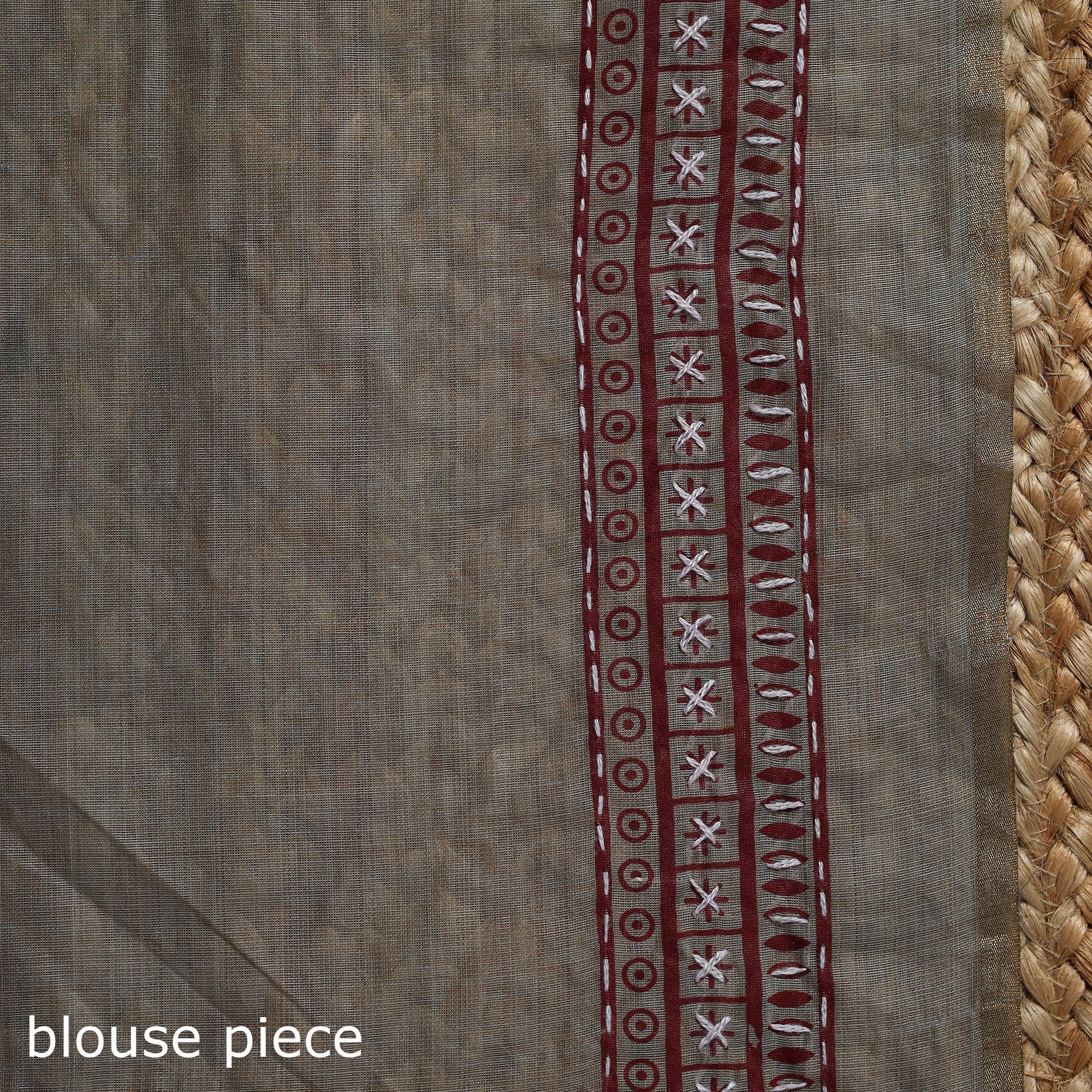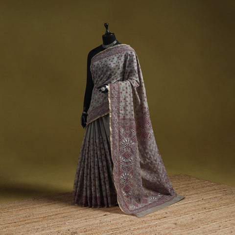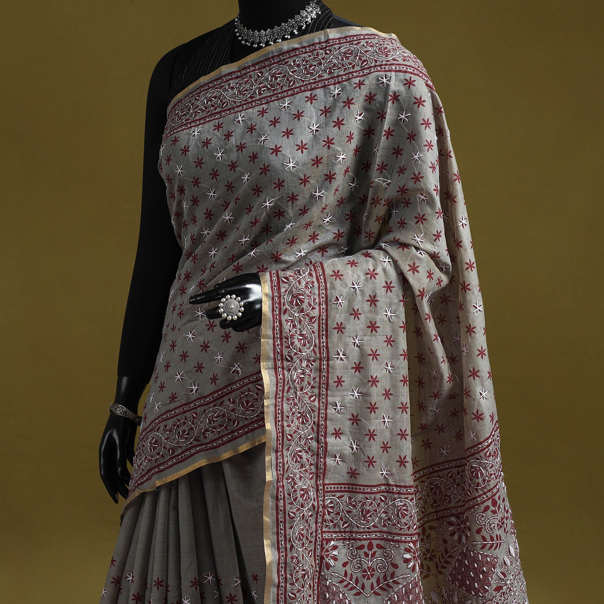 Grey kantha work silk-cotton saree is hand-embroidered with detailed kantha motifs inspired by nature and daily life. Crafted by skilled rural artisans, it blends comfort and elegance effortlessly. The saree features subtle chapa work under the embroidery, adding depth and character to the design. Light, smooth and easy to drape, it’s perfect for festive occasions, cultural gatherings, or everyday wear.