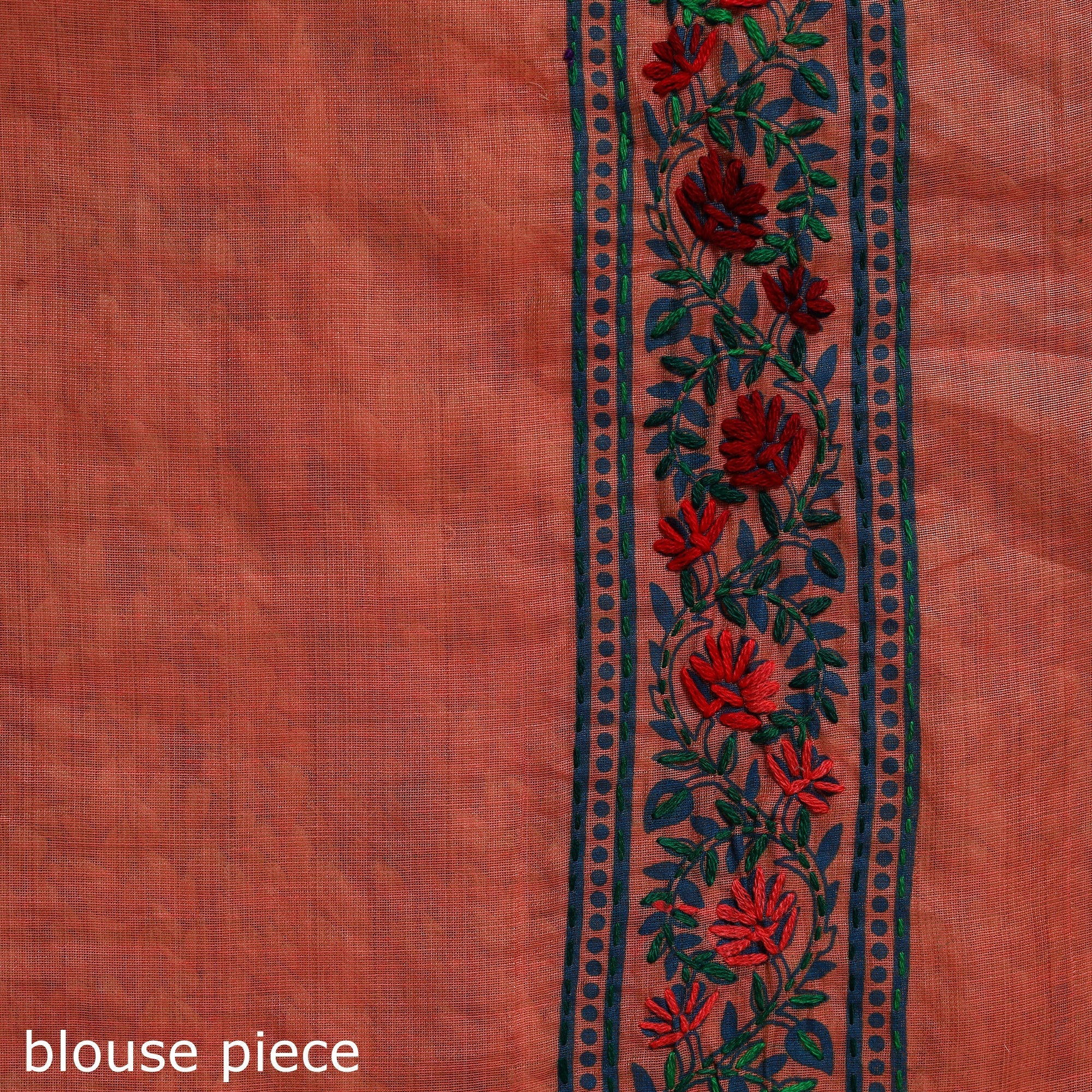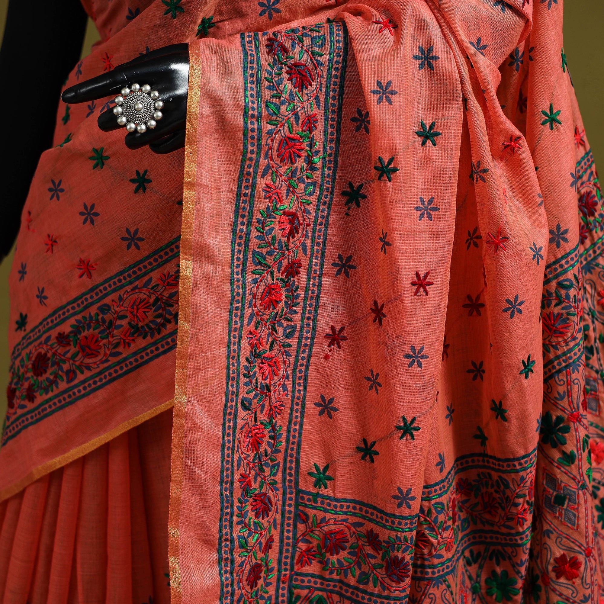 Peach kantha work silk-cotton saree is hand-embroidered with detailed kantha motifs inspired by nature and daily life. Crafted by skilled rural artisans, it blends comfort and elegance effortlessly. The saree features subtle chapa work under the embroidery, adding depth and character to the design. Light, smooth and easy to drape, it’s perfect for festive occasions, cultural gatherings, or everyday wear.