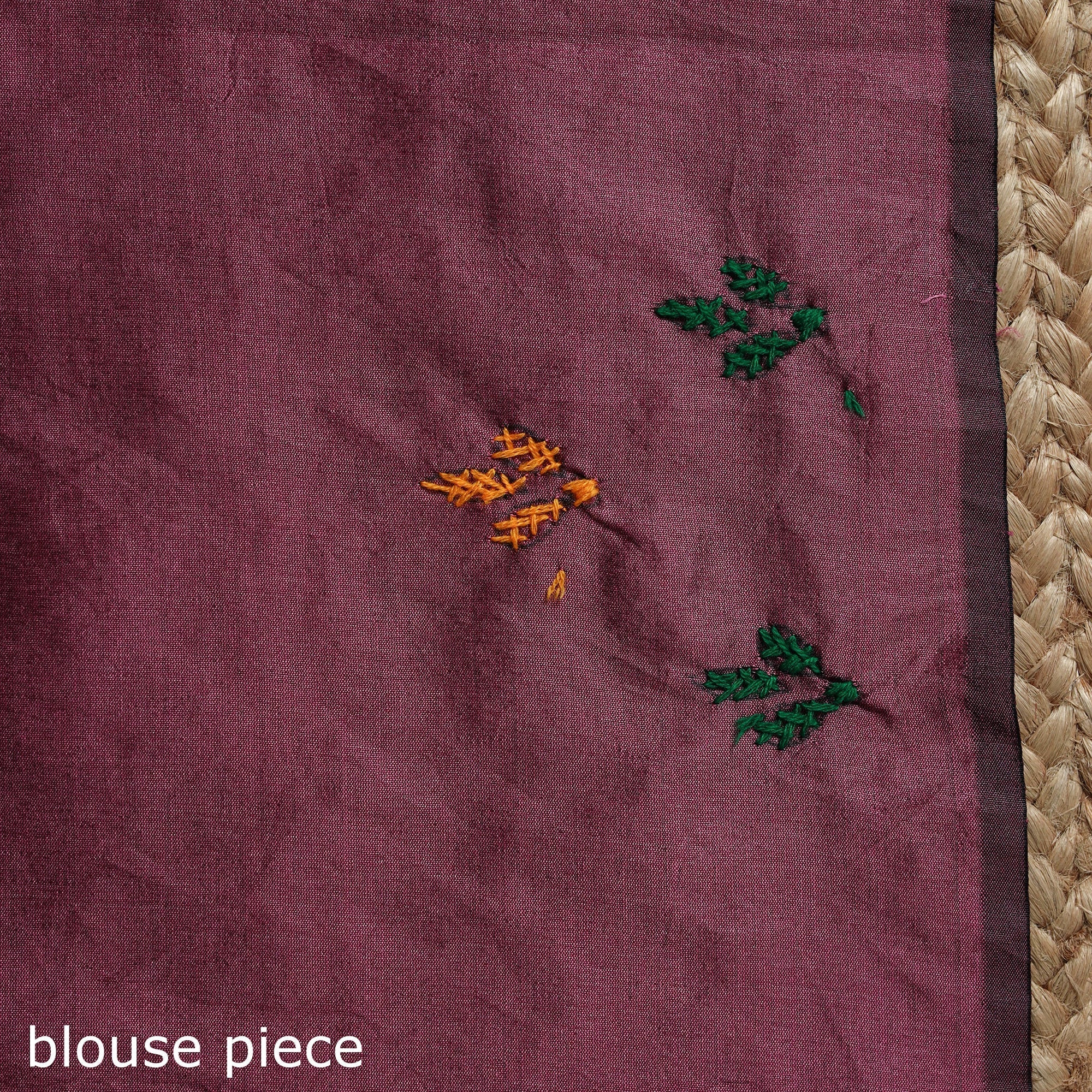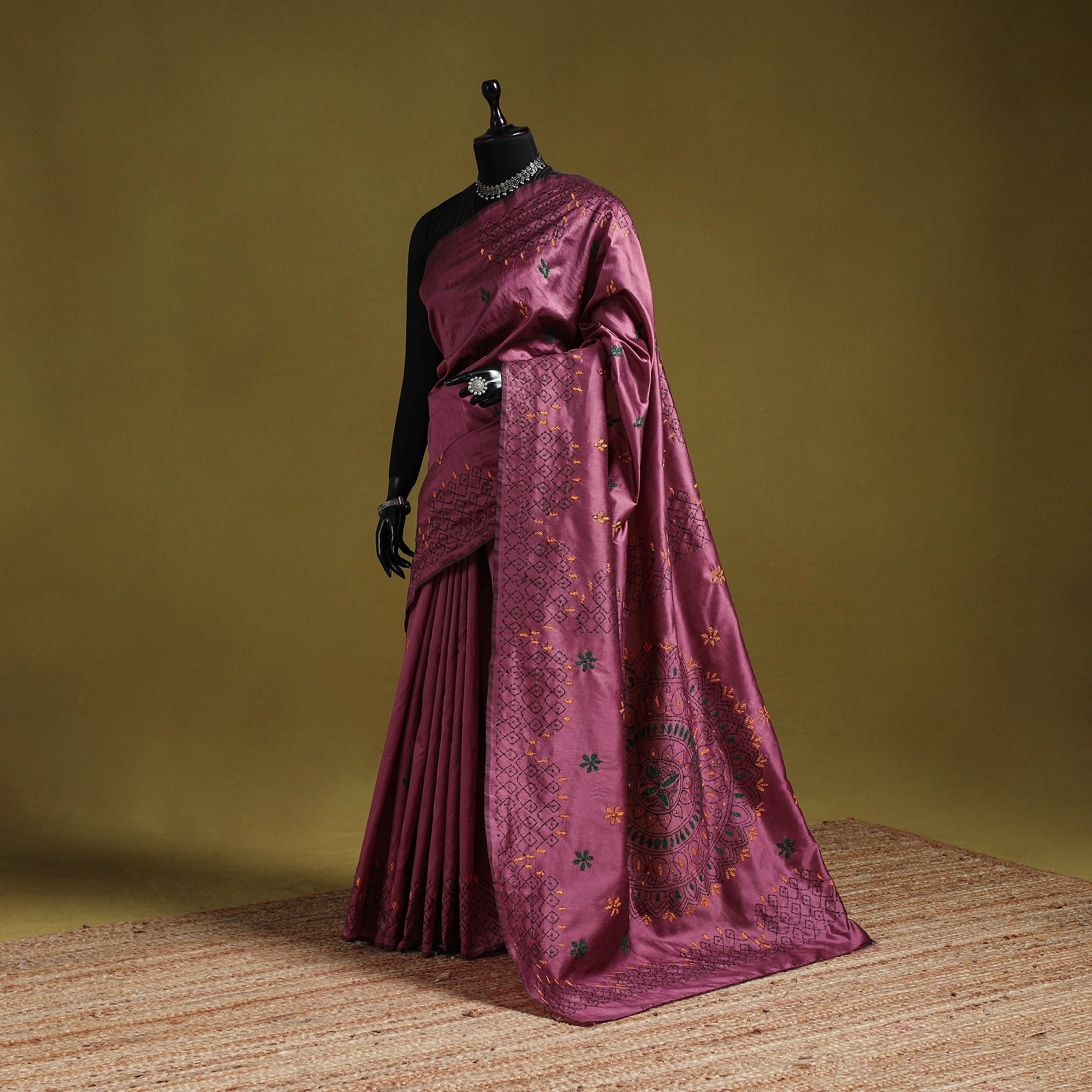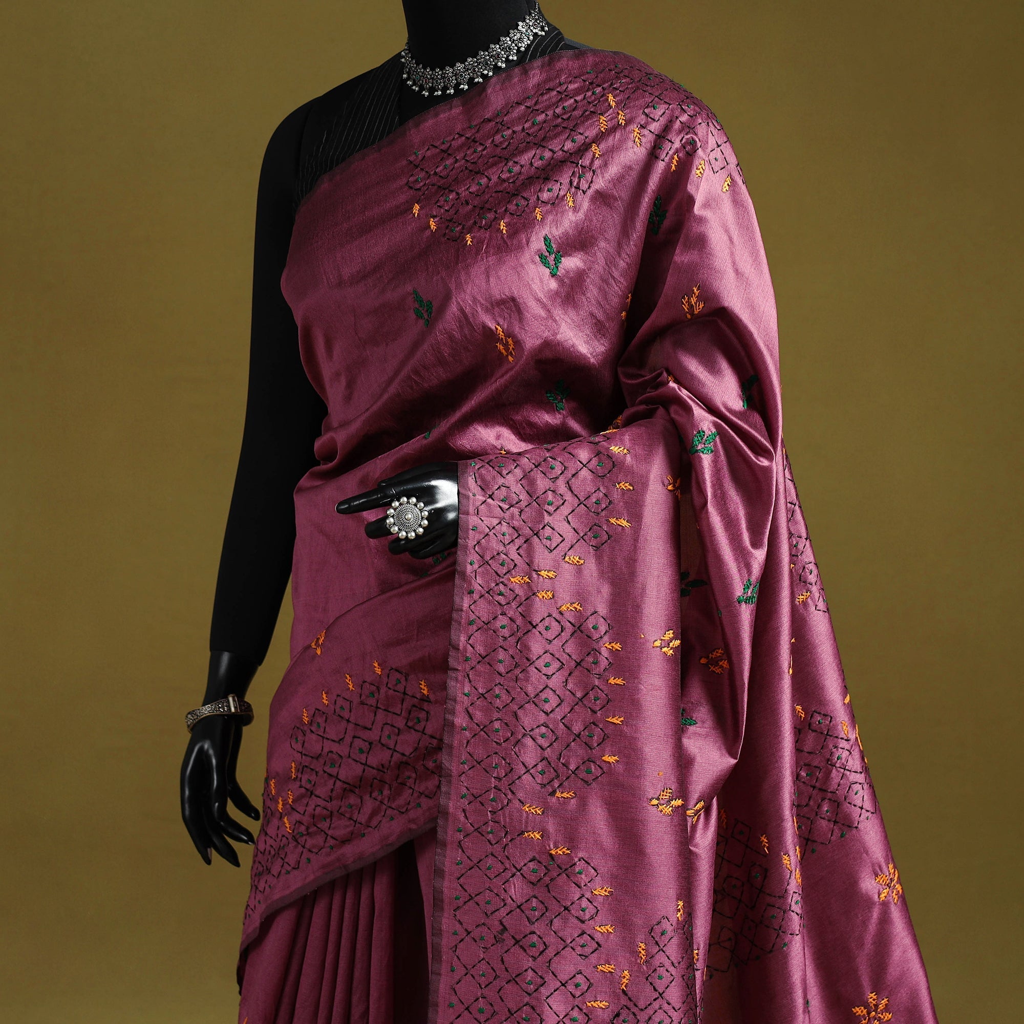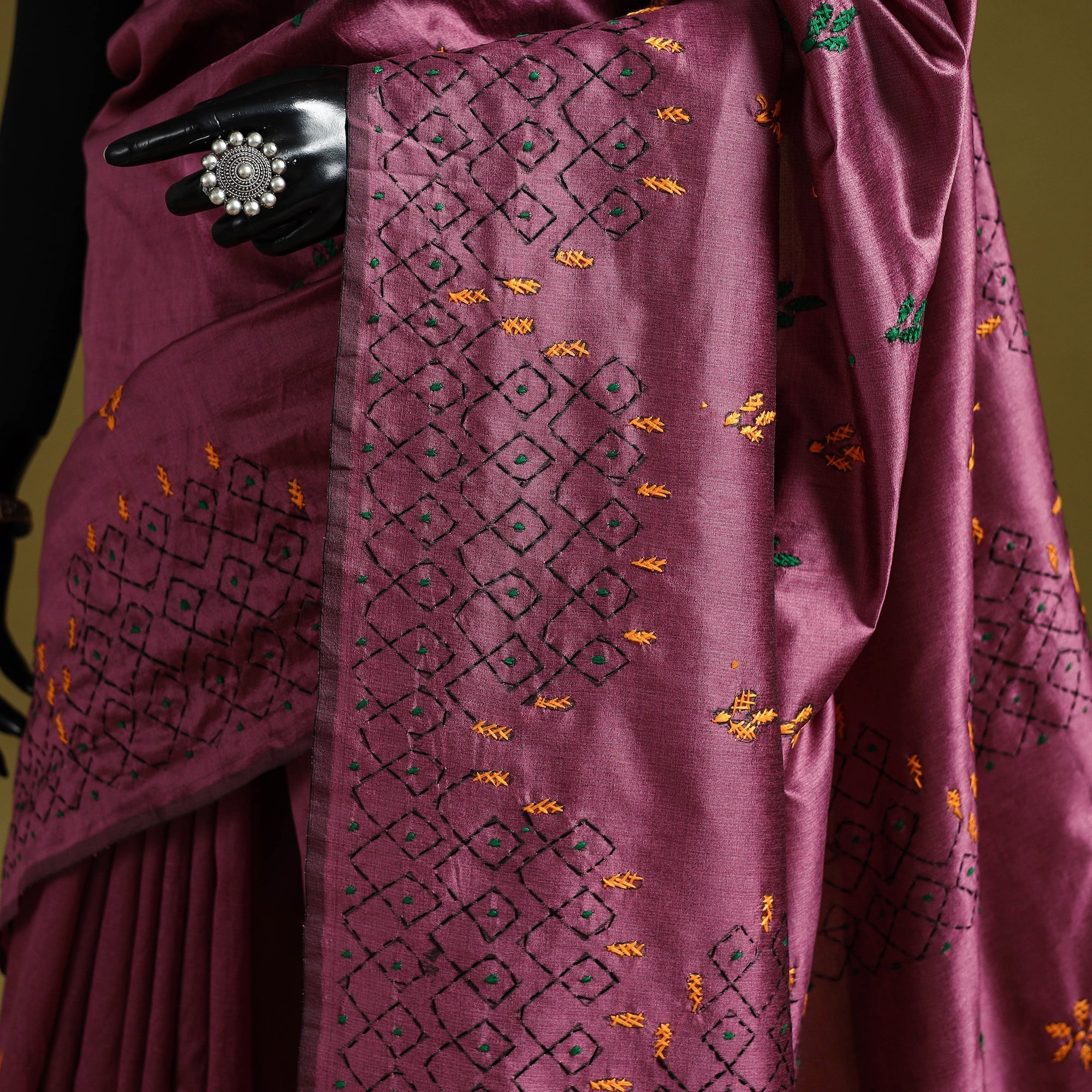 Purple kantha work art silk saree is a beautiful piece of Bengal’s tradition, hand-embroidered with detailed nakshi kantha motifs inspired by nature and daily life. Made by skilled rural artisans, it blends elegance, comfort, and culture in every stitch. Light in weight and easy to drape, it is perfect for festive occasions, cultural gatherings, or everyday wear.