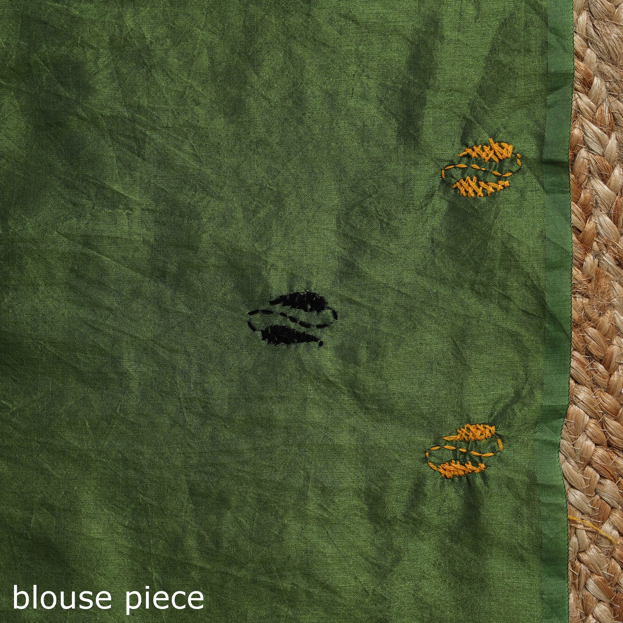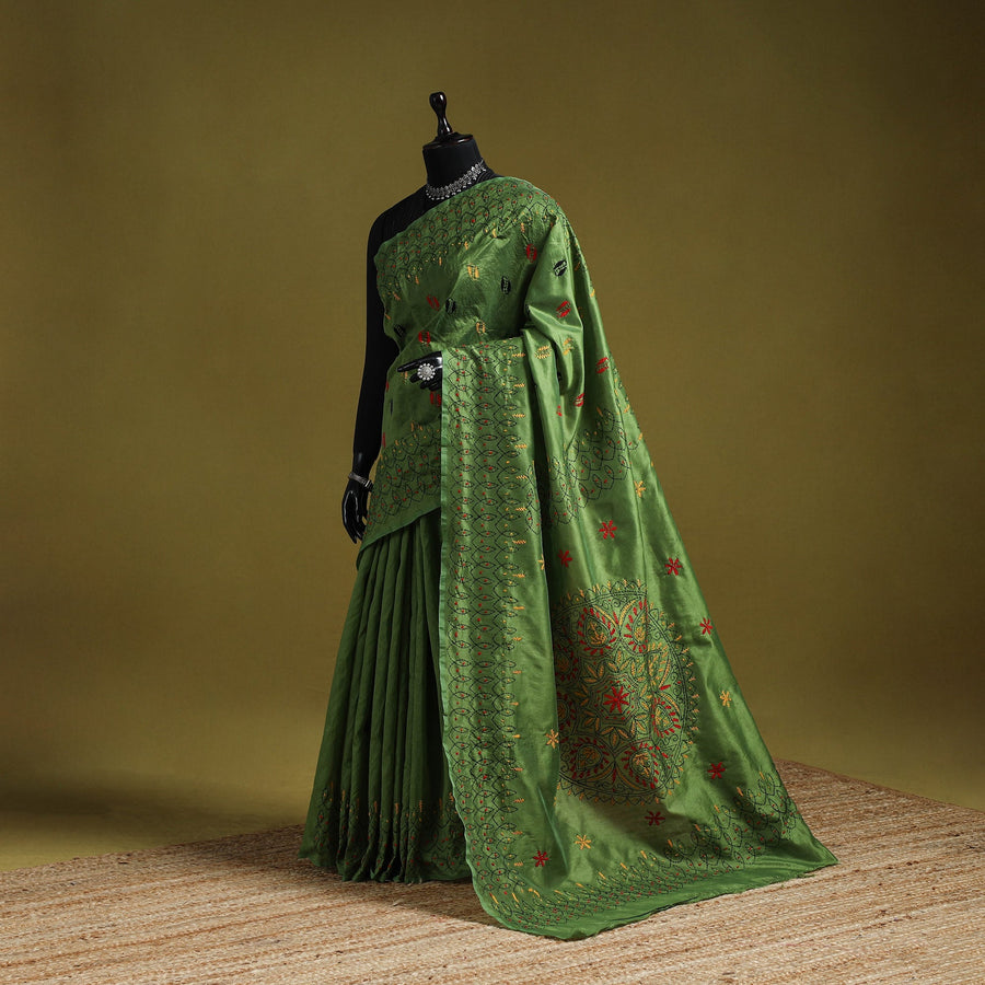 Green kantha work art silk saree is a beautiful piece of Bengal’s tradition, hand-embroidered with detailed nakshi kantha motifs inspired by nature and daily life. Made by skilled rural artisans, it blends elegance, comfort, and culture in every stitch. Light in weight and easy to drape, it is perfect for festive occasions, cultural gatherings, or everyday wear.