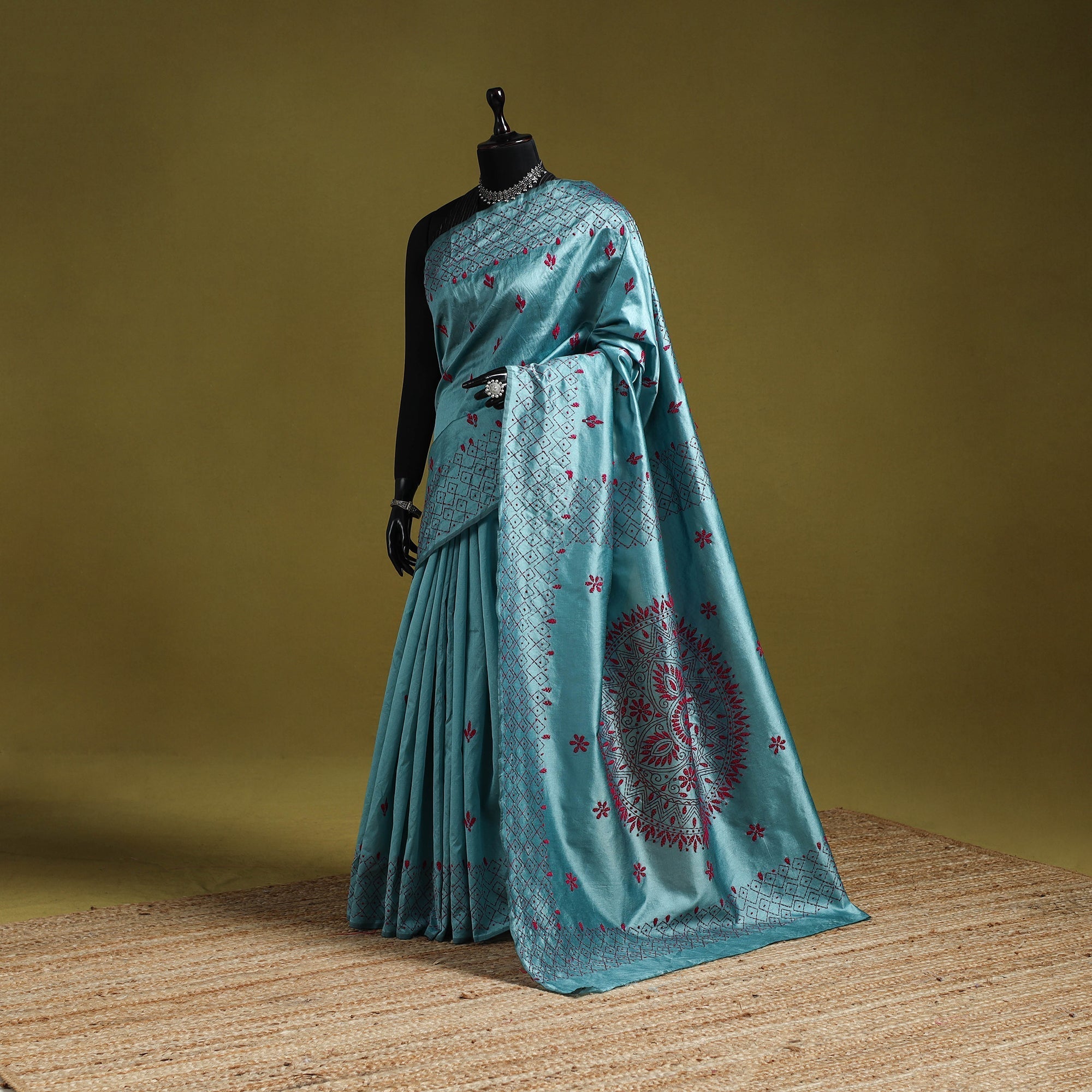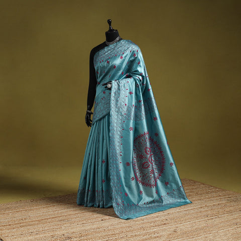 | Material | Blue kantha work art silk saree is a beautiful piece of Bengal’s tradition, hand-embroidered with detailed nakshi kantha motifs inspired by nature and daily life. Made by skilled rural artisans, it blends elegance, comfort, and culture in every stitch. Light in weight and easy to drape, it is perfect for festive occasions, cultural gatherings, or everyday wear. |
