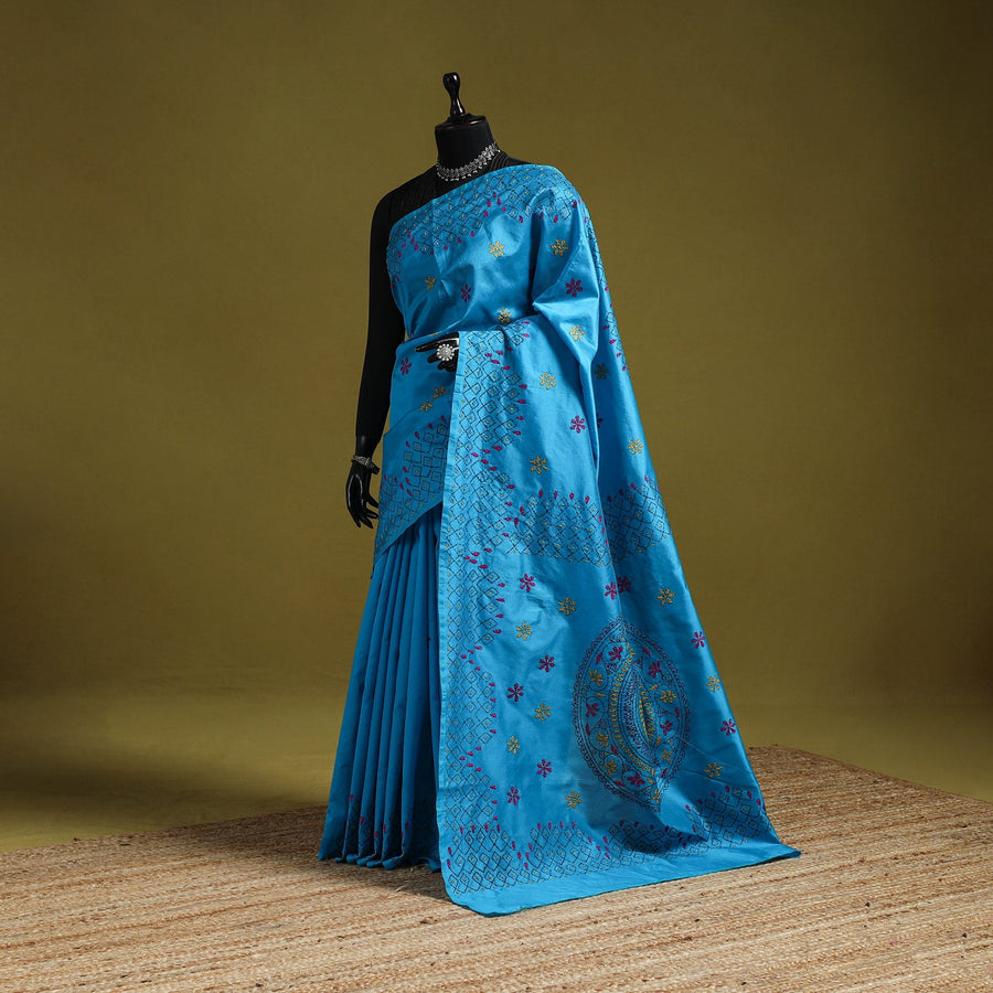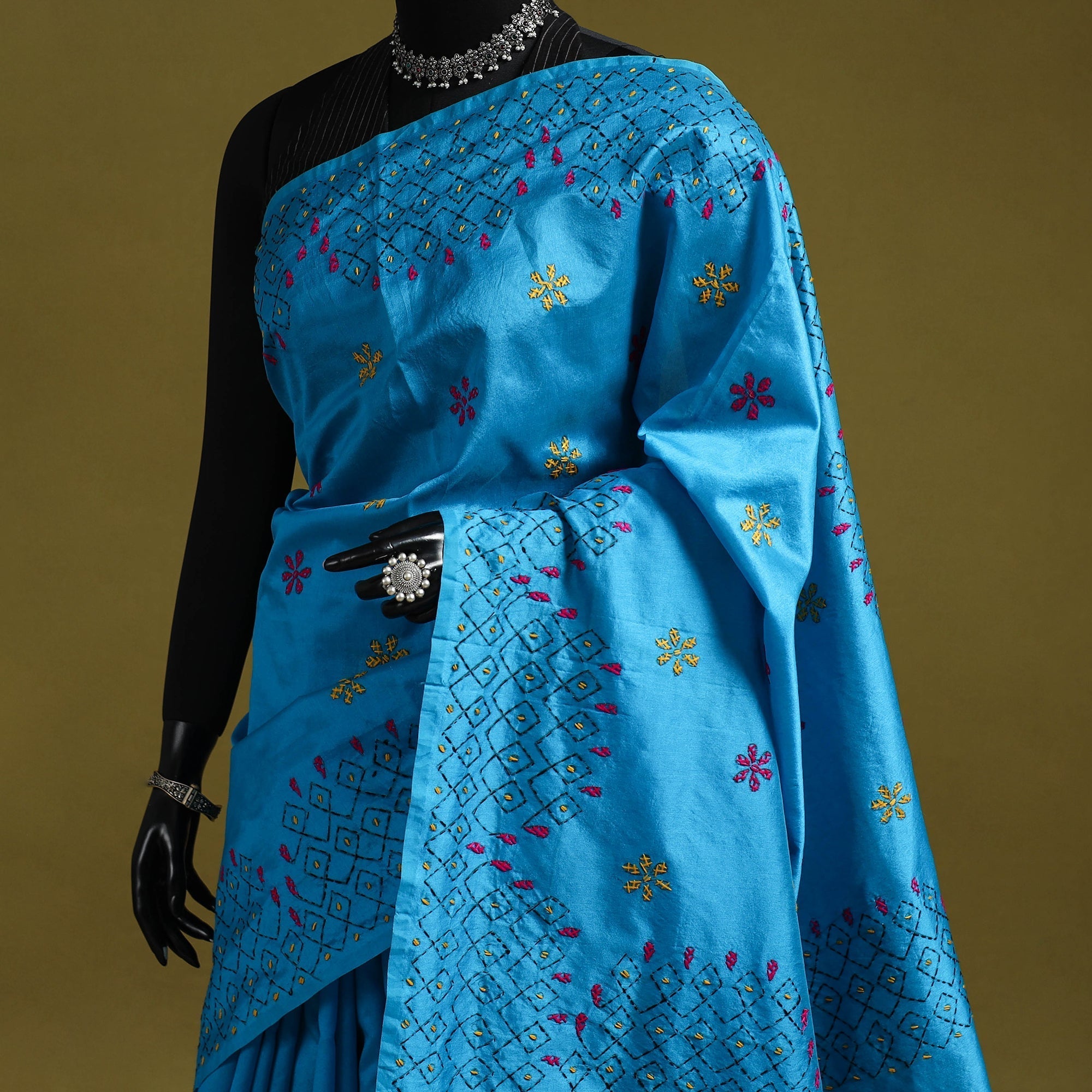 Blue kantha work art silk saree is a beautiful piece of Bengal’s tradition, hand-embroidered with detailed nakshi kantha motifs inspired by nature and daily life. Made by skilled rural artisans, it blends elegance, comfort, and culture in every stitch. Light in weight and easy to drape, it is perfect for festive occasions, cultural gatherings, or everyday wear.