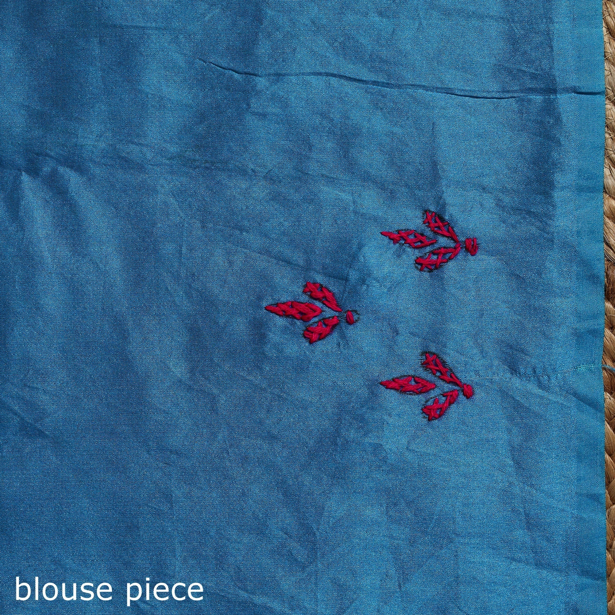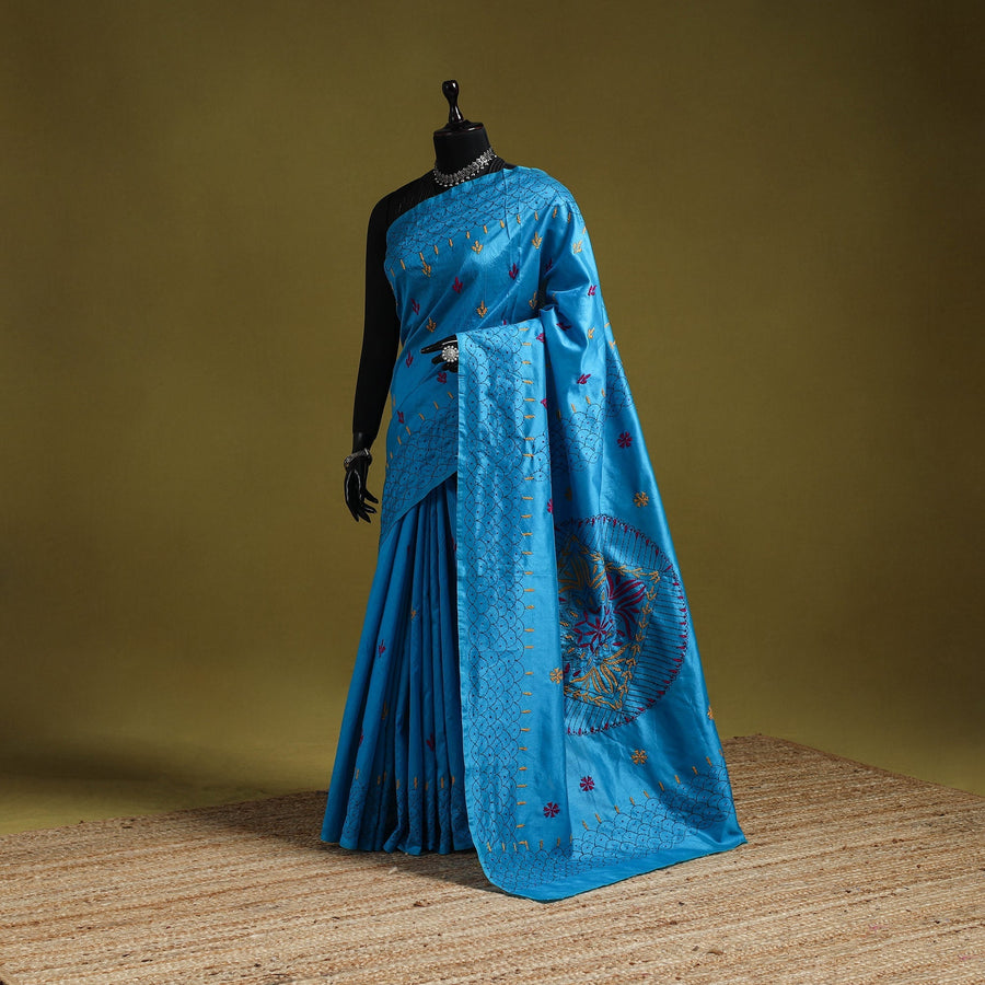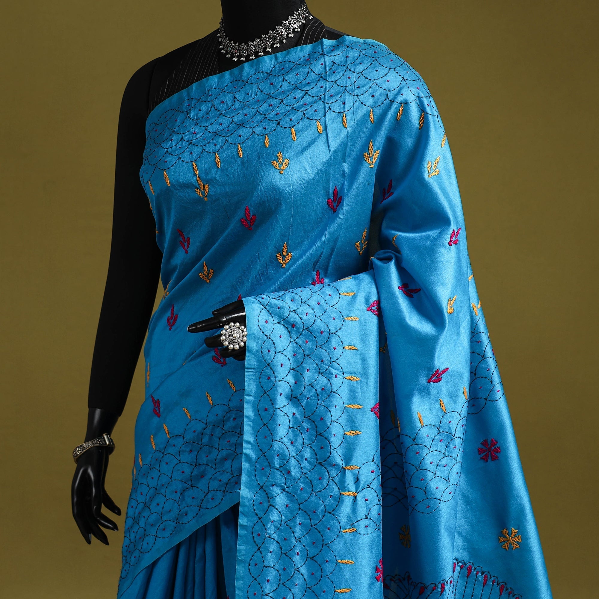 Blue kantha work art silk saree is a beautiful piece of Bengal’s tradition, hand-embroidered with detailed nakshi kantha motifs inspired by nature and daily life. Made by skilled rural artisans, it blends elegance, comfort, and culture in every stitch. Light in weight and easy to drape, it is perfect for festive occasions, cultural gatherings, or everyday wear.