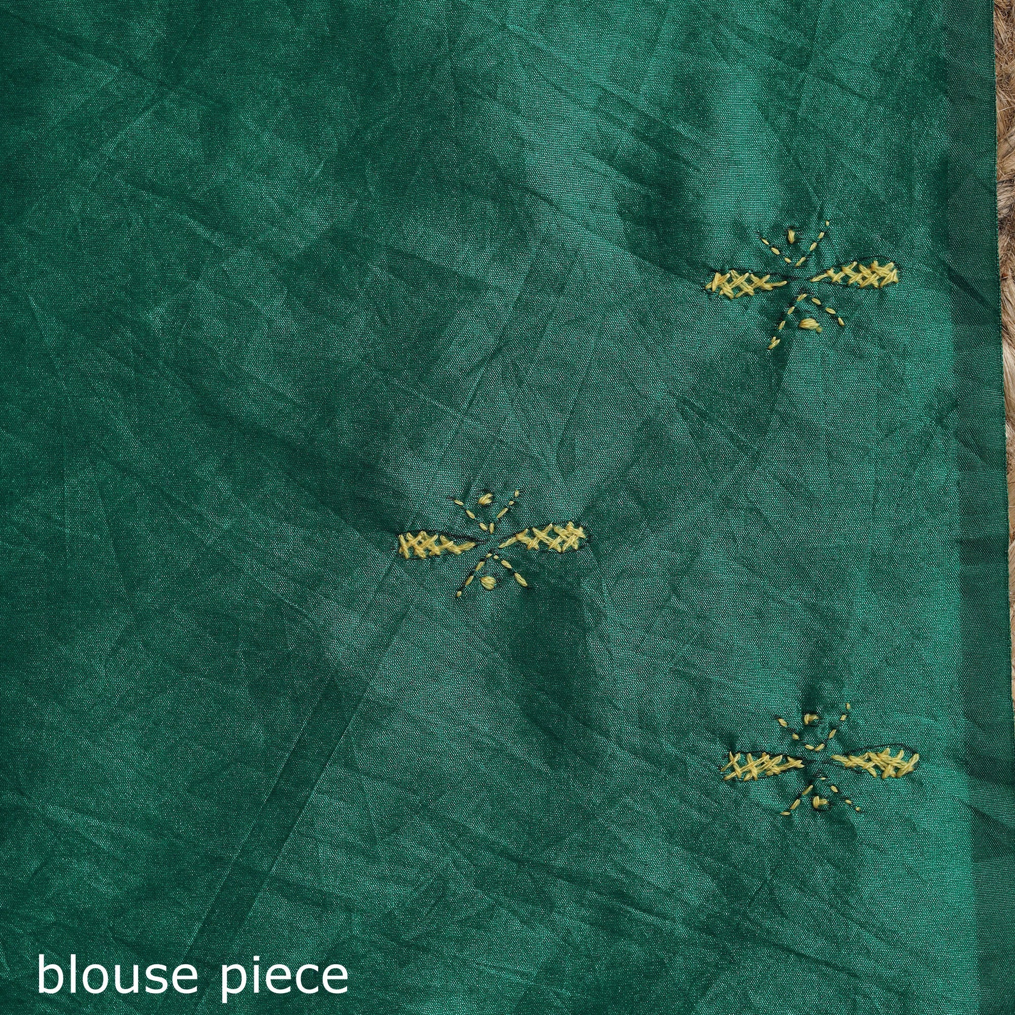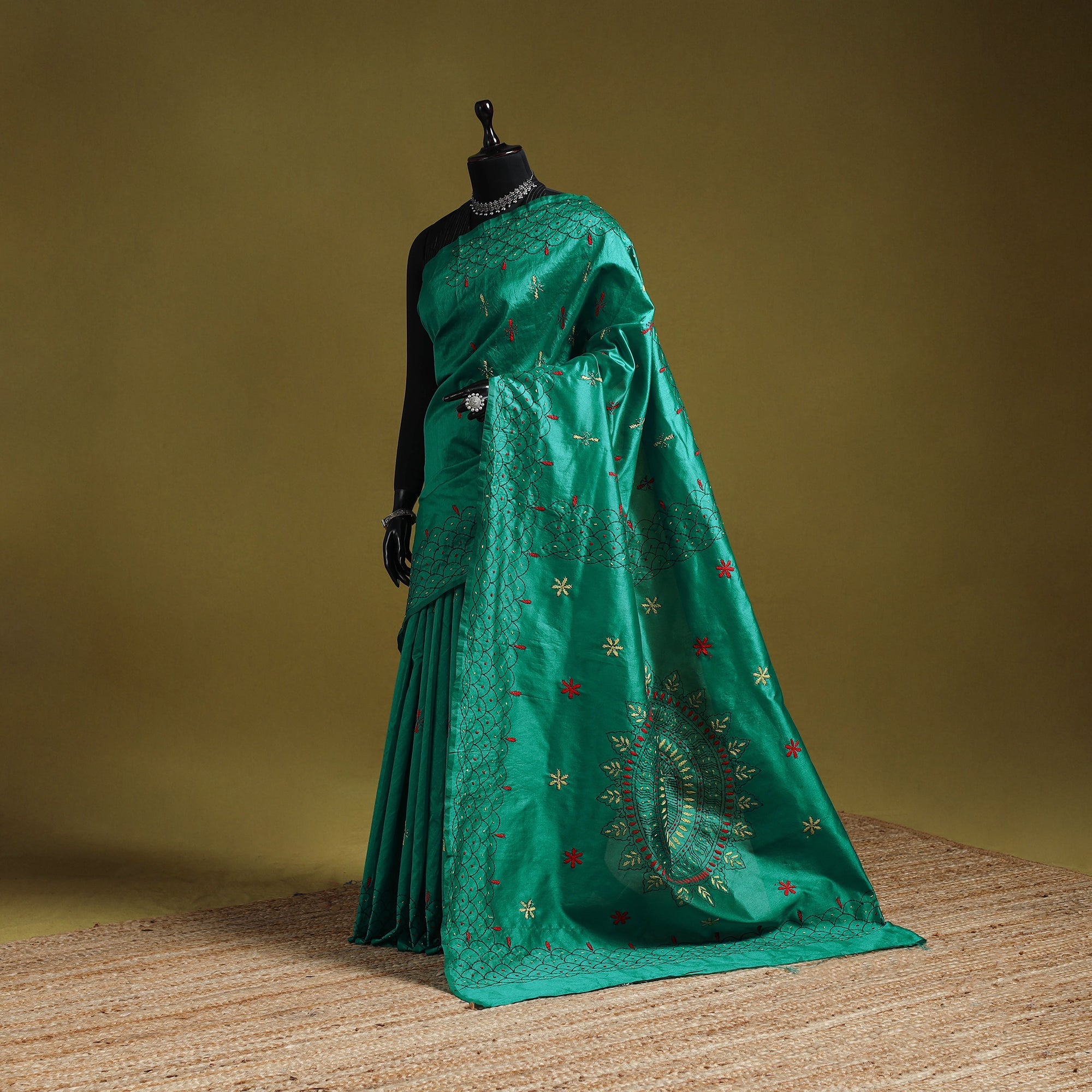Green kantha work art silk saree is a beautiful piece of Bengal’s tradition, hand-embroidered with detailed nakshi kantha motifs inspired by nature and daily life. Made by skilled rural artisans, it blends elegance, comfort, and culture in every stitch. Light in weight and easy to drape, it is perfect for festive occasions, cultural gatherings, or everyday wear.