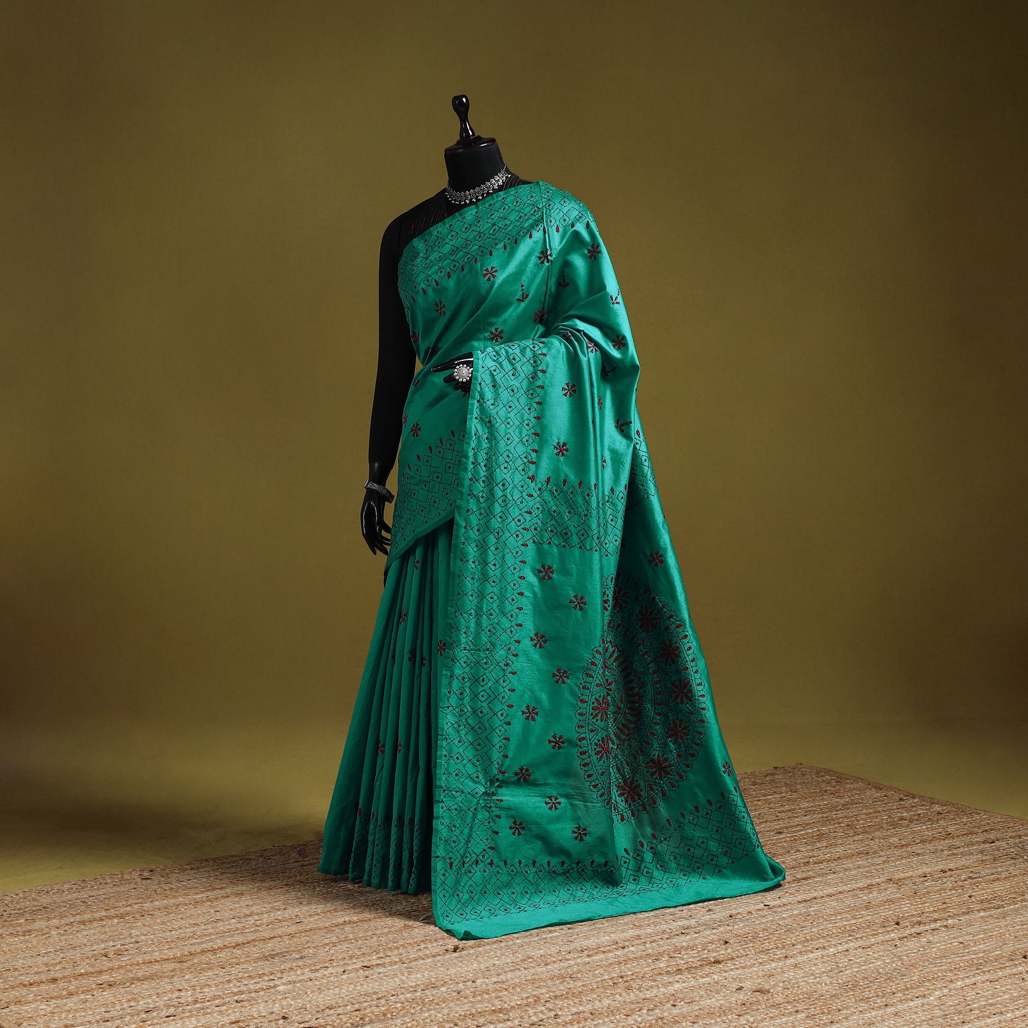 Green kantha work art silk saree is a beautiful piece of Bengal’s tradition, hand-embroidered with detailed nakshi kantha motifs inspired by nature and daily life. Made by skilled rural artisans, it blends elegance, comfort, and culture in every stitch. Light in weight and easy to drape, it is perfect for festive occasions, cultural gatherings, or everyday wear.