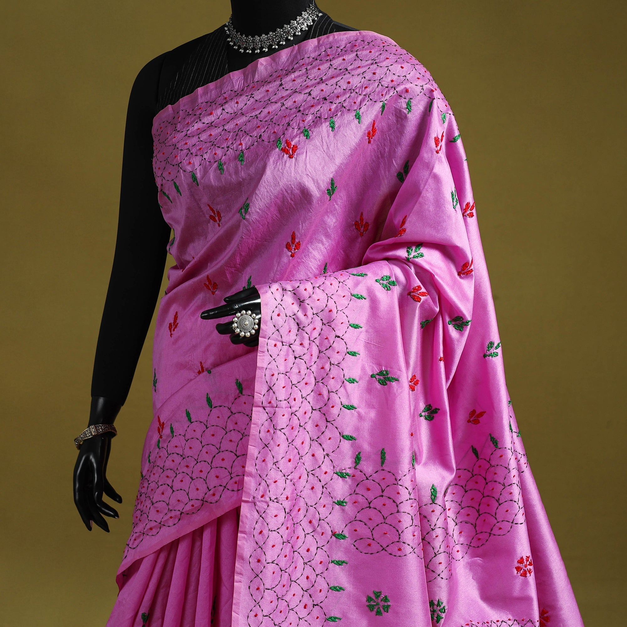 Pink kantha work art silk saree is a beautiful piece of Bengal’s tradition, hand-embroidered with detailed nakshi kantha motifs inspired by nature and daily life. Made by skilled rural artisans, it blends elegance, comfort, and culture in every stitch. Light in weight and easy to drape, it is perfect for festive occasions, cultural gatherings, or everyday wear.