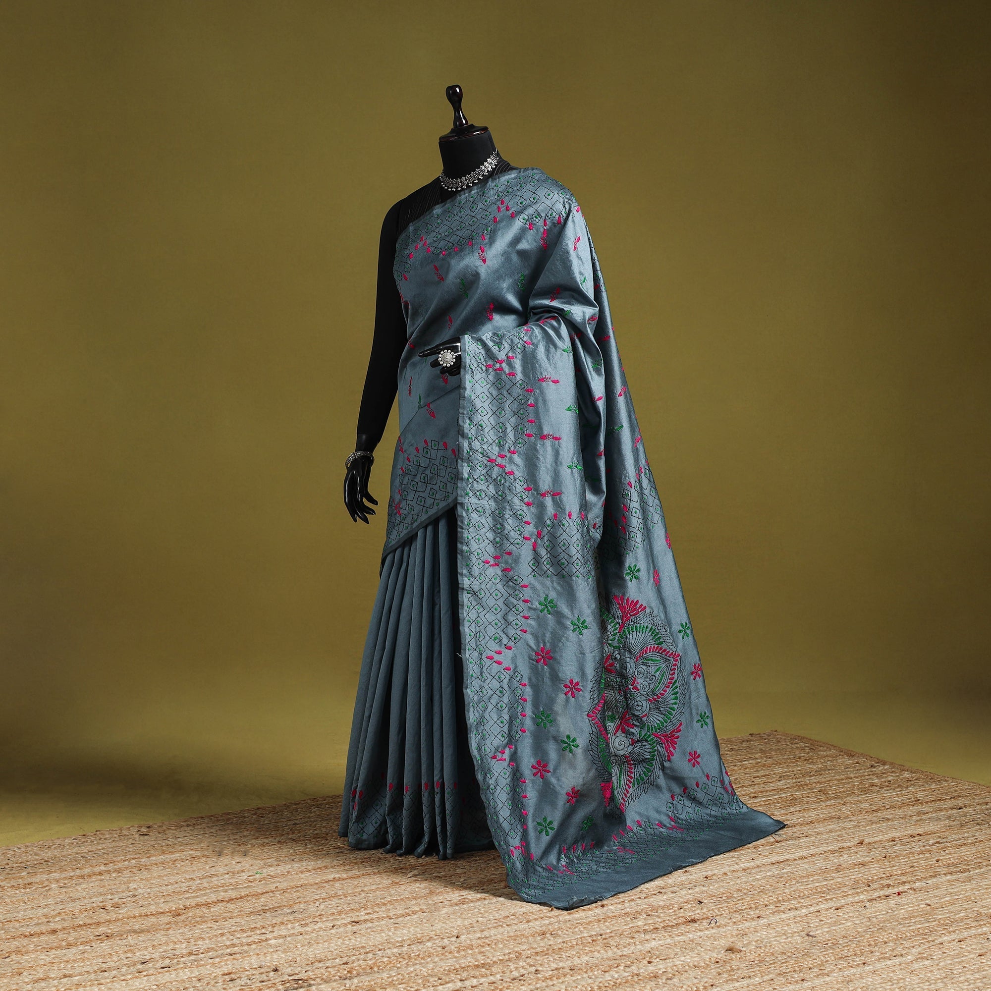 Grey kantha work art silk saree is a beautiful piece of Bengal’s tradition, hand-embroidered with detailed nakshi kantha motifs inspired by nature and daily life. Made by skilled rural artisans, it blends elegance, comfort, and culture in every stitch. Light in weight and easy to drape, it is perfect for festive occasions, cultural gatherings, or everyday wear.