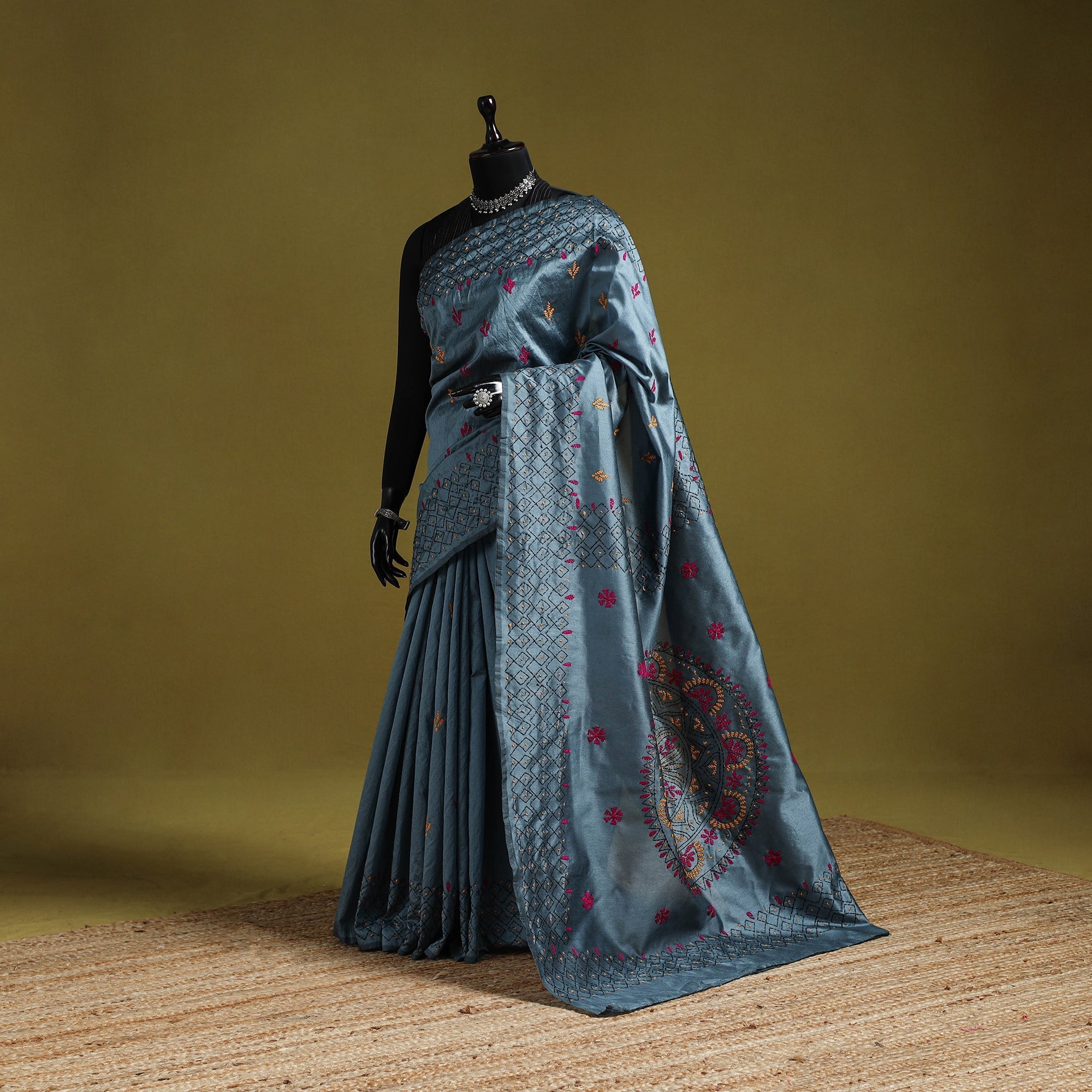 Grey kantha work art silk saree is a beautiful piece of Bengal’s tradition, hand-embroidered with detailed nakshi kantha motifs inspired by nature and daily life. Made by skilled rural artisans, it blends elegance, comfort, and culture in every stitch. Light in weight and easy to drape, it is perfect for festive occasions, cultural gatherings, or everyday wear.