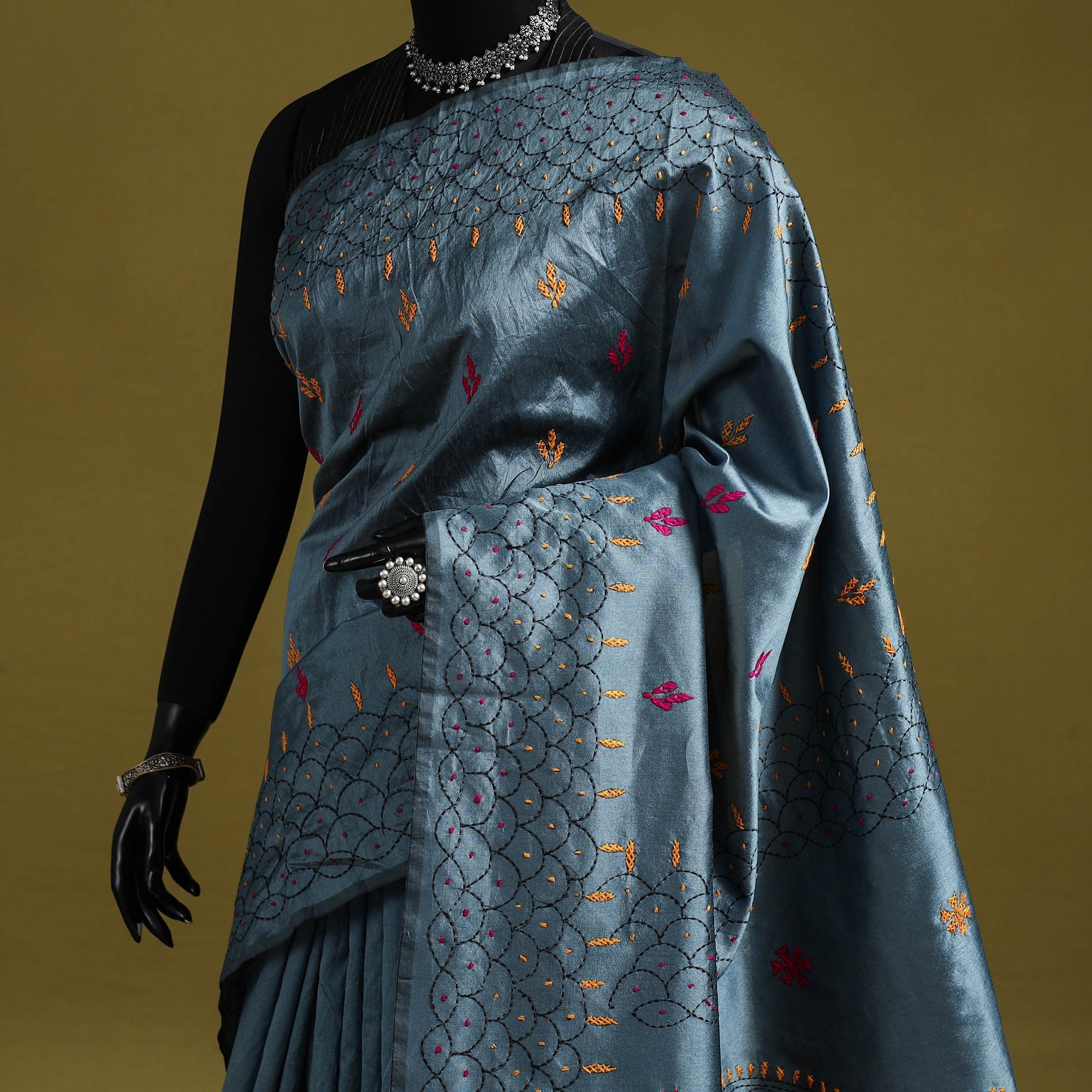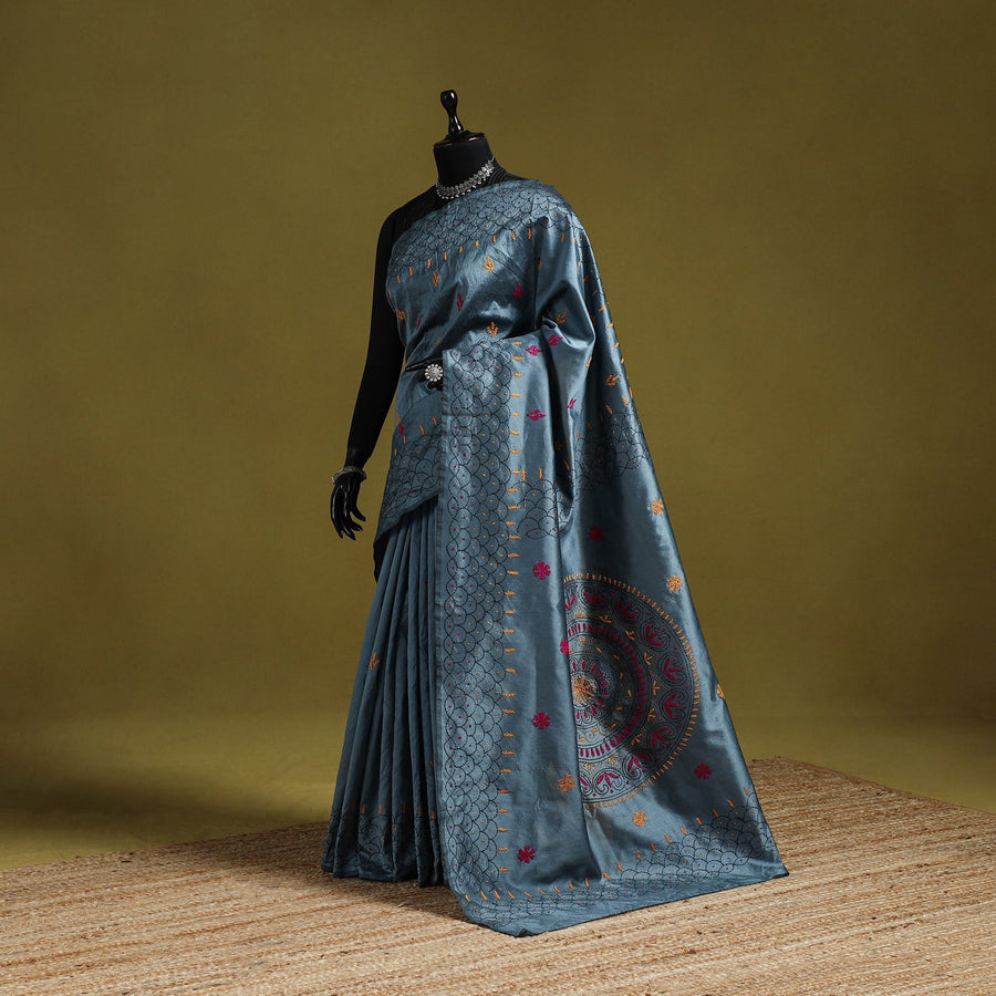 Grey kantha work art silk saree is a beautiful piece of Bengal’s tradition, hand-embroidered with detailed nakshi kantha motifs inspired by nature and daily life. Made by skilled rural artisans, it blends elegance, comfort, and culture in every stitch. Light in weight and easy to drape, it is perfect for festive occasions, cultural gatherings, or everyday wear.