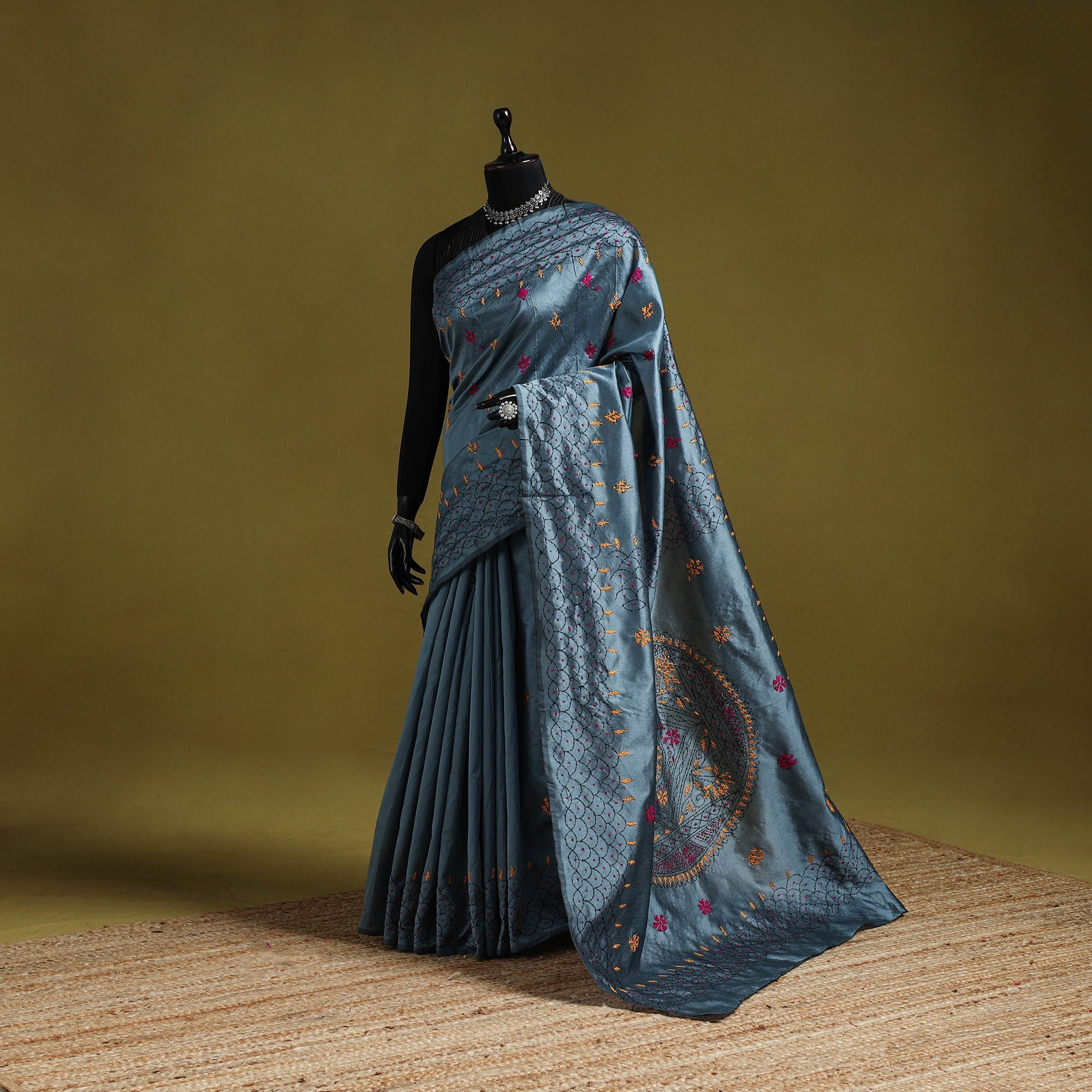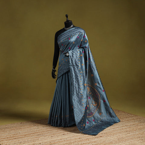 Grey - Bengal Hand Embroidery Silk Nakshi Kantha Saree 46