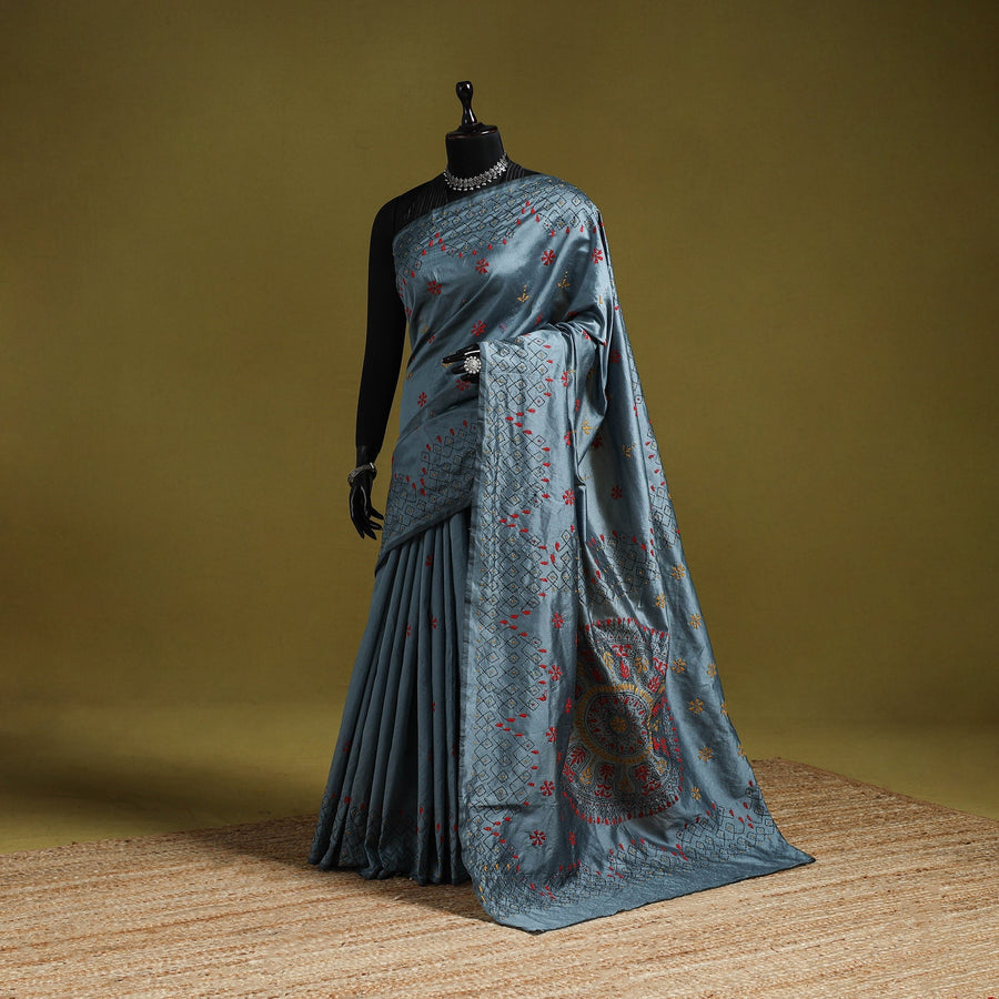 Grey - Bengal Hand Embroidery Silk Nakshi Kantha Saree 47