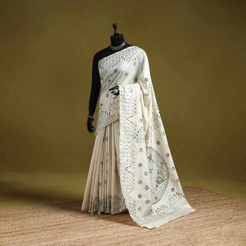 White - Bengal Hand Embroidery Silk Nakshi Kantha Saree 52