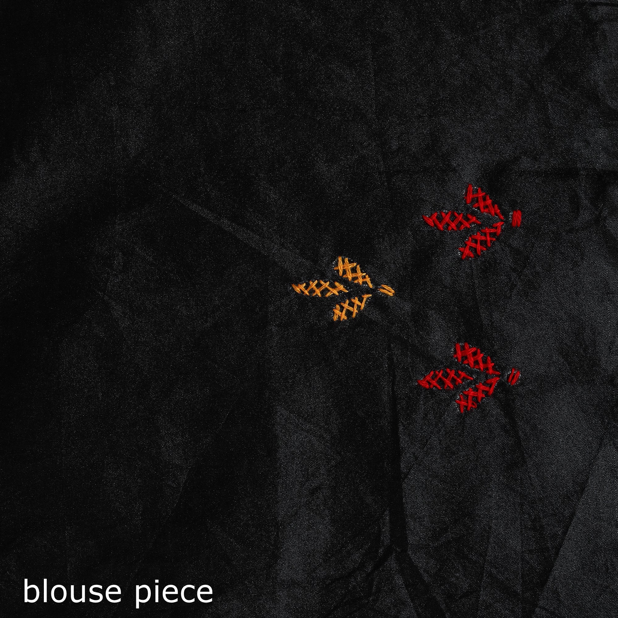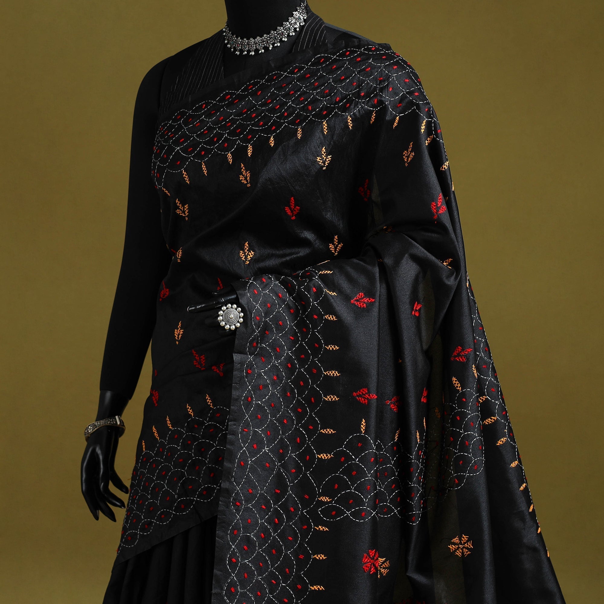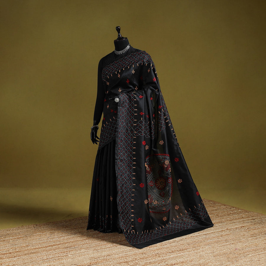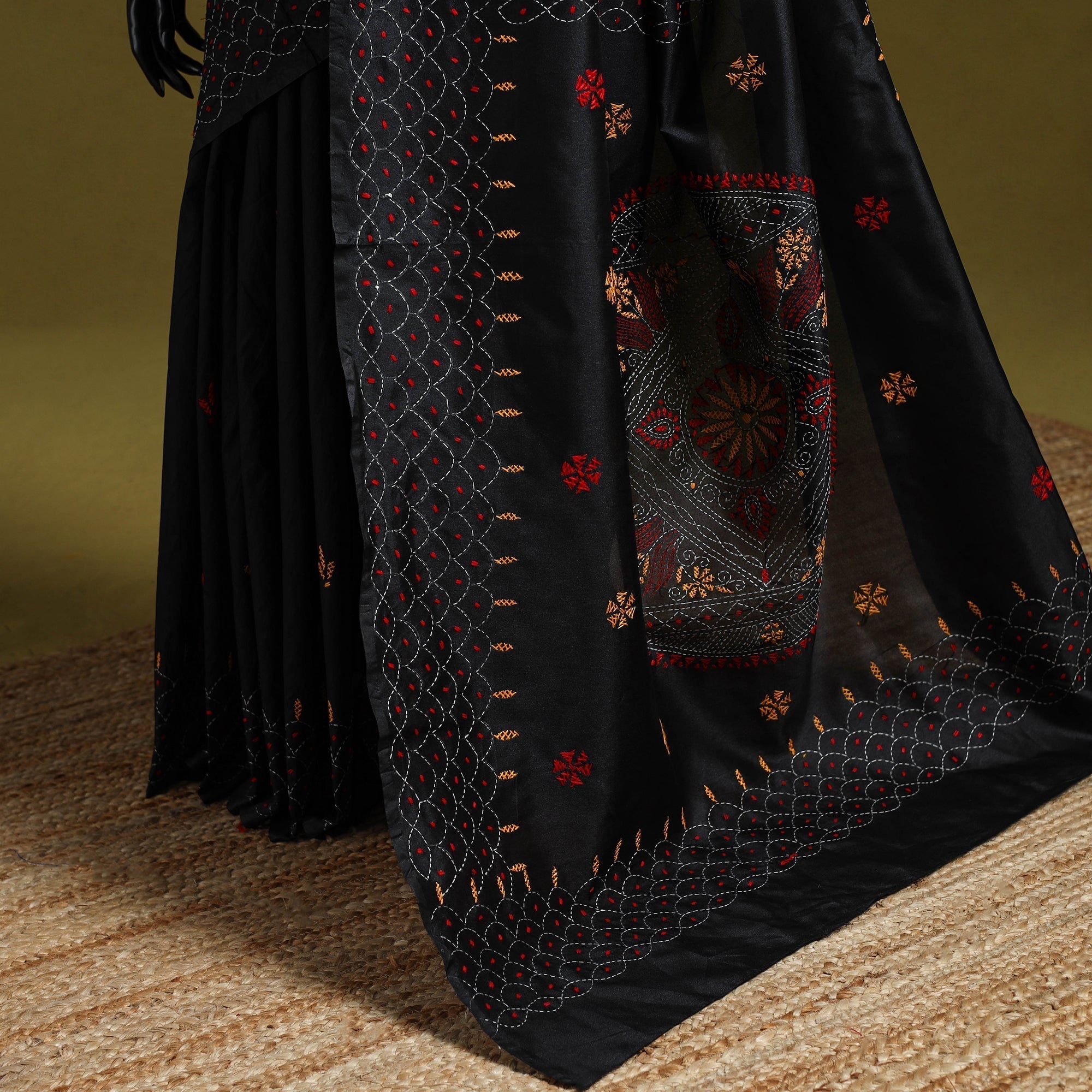 Black kantha work art silk saree is a beautiful piece of Bengal’s tradition, hand-embroidered with detailed nakshi kantha motifs inspired by nature and daily life. Made by skilled rural artisans, it blends elegance, comfort, and culture in every stitch. Light in weight and easy to drape, it is perfect for festive occasions, cultural gatherings, or everyday wear.