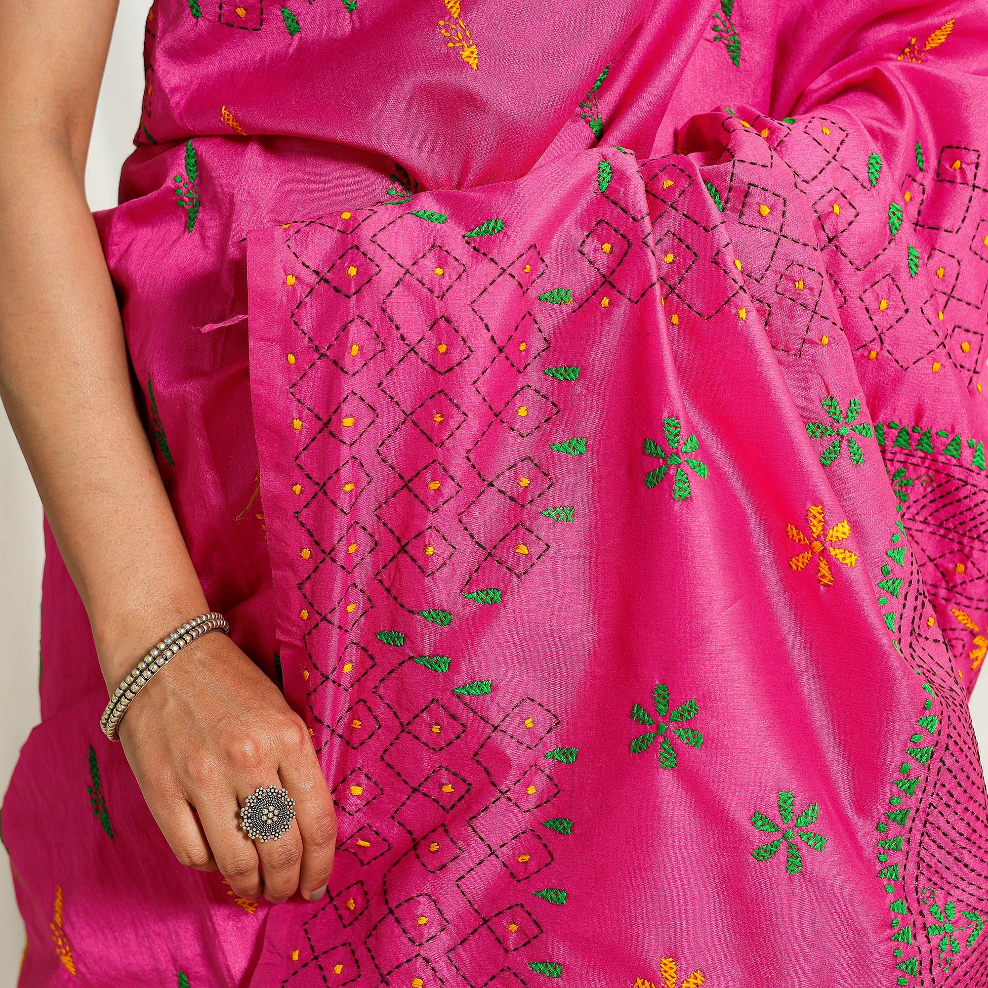 Celebrate Bengal’s heritage with this pink kantha saree, hand-embroidered on silk. Crafted by skilled rural artisans, it features intricate nakshi Kantha motifs inspired by nature and everyday life. Lightweight and graceful, it’s perfect for festive occasions or daily wear. This kantha silk saree embodies elegance, comfort, and tradition.
