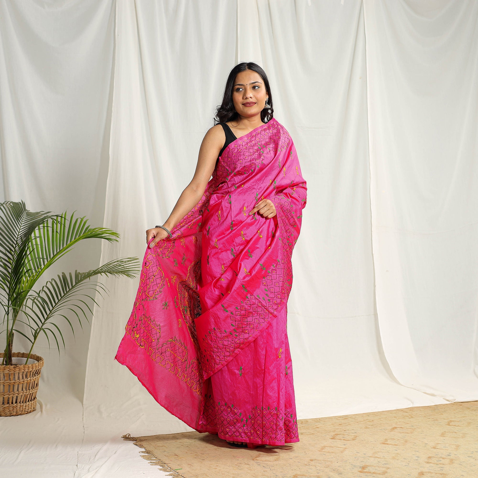 Celebrate Bengal’s heritage with this pink kantha saree, hand-embroidered on silk. Crafted by skilled rural artisans, it features intricate nakshi Kantha motifs inspired by nature and everyday life. Lightweight and graceful, it’s perfect for festive occasions or daily wear. This kantha silk saree embodies elegance, comfort, and tradition.