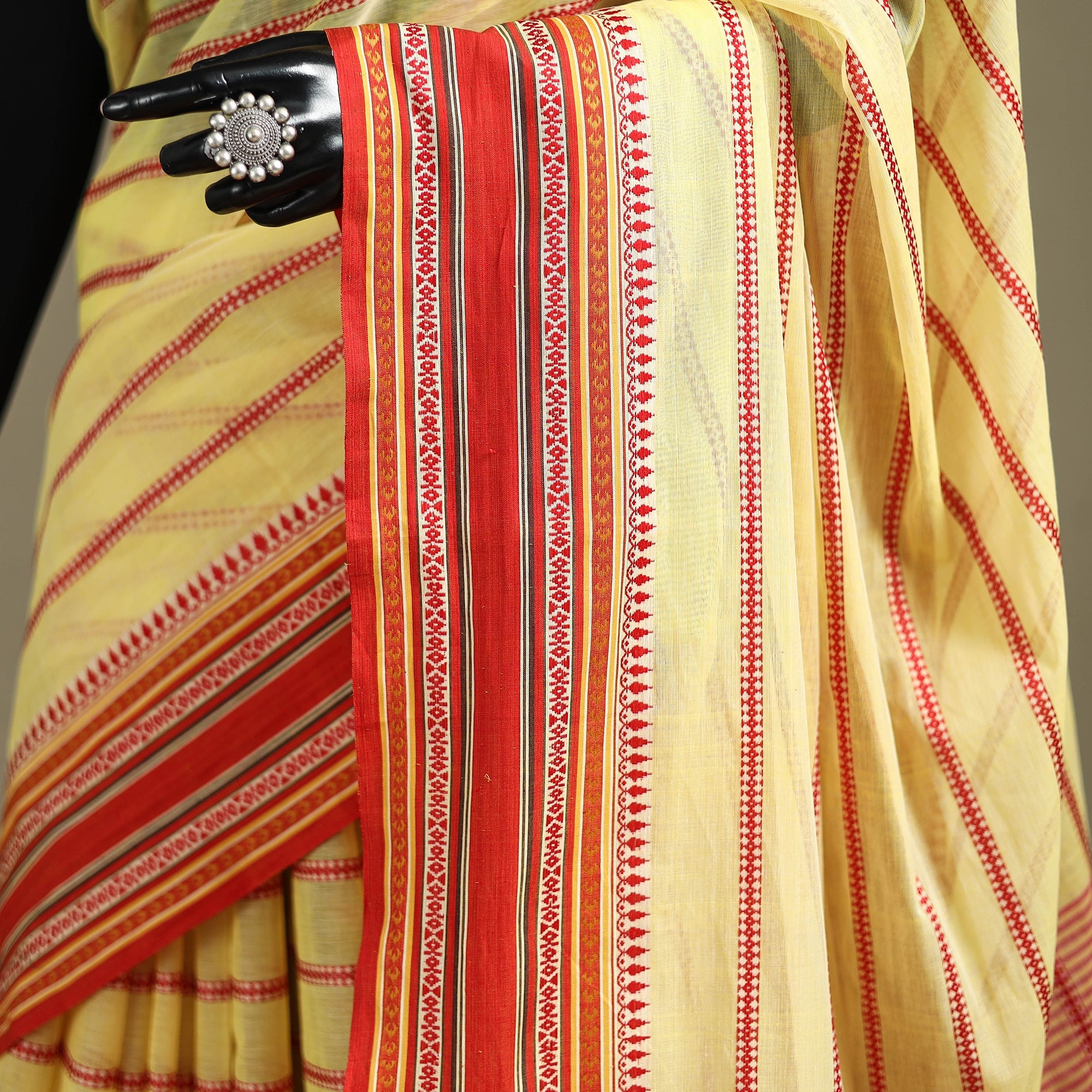 Yellow begumpuri handwoven cotton saree by Sasha from West Bengal. Known for its lightweight and breathable texture this saree showcases thread weaving techniques, reflecting the of traditional wooden dobby loom craftsmanship. Perfect for both occasional outings and everyday wear.