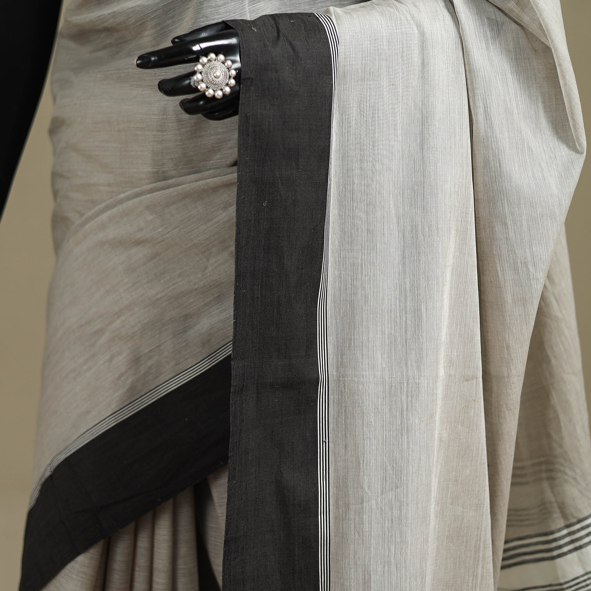 Grey begumpuri handwoven cotton saree by Sasha from West Bengal. Known for its lightweight and breathable texture this saree showcases thread weaving techniques, reflecting the of traditional wooden dobby loom craftsmanship. Perfect for both occasional outings and everyday wear.