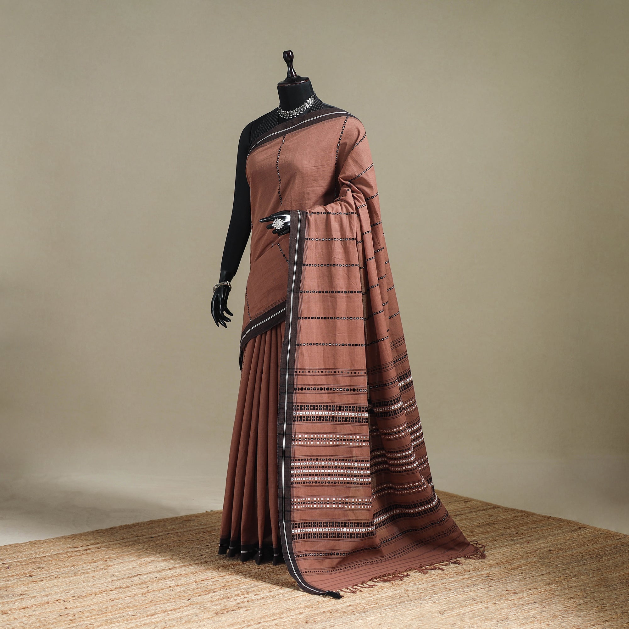 Brown begumpuri handwoven cotton saree by Sasha from West Bengal. Known for its lightweight and breathable texture this saree showcases thread weaving techniques, reflecting the of traditional wooden dobby loom craftsmanship. Perfect for both occasional outings and everyday wear.