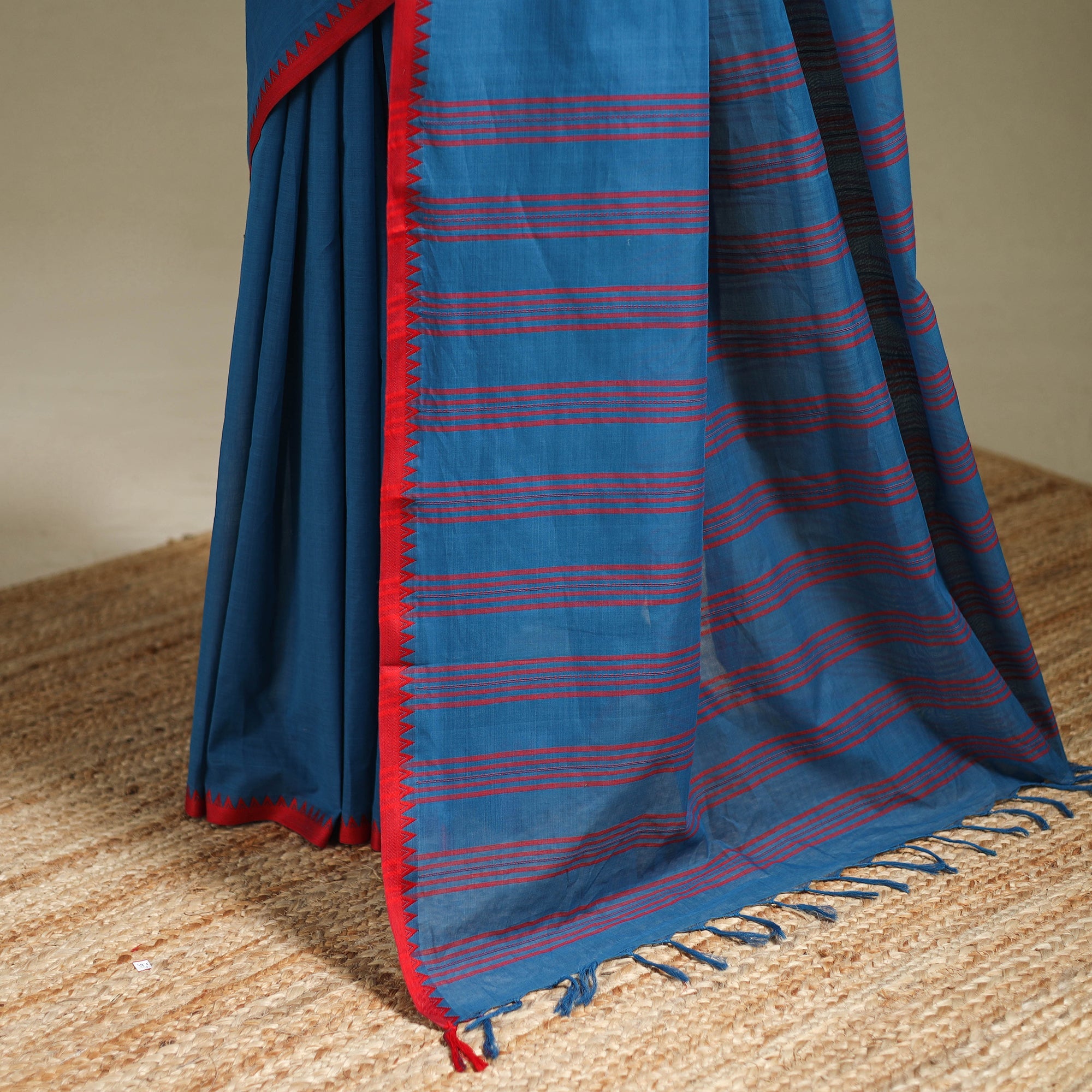 Begampuri sari is woven in a balanced texture with contrasting edges in red, black, purple, and orange and accented with cut edges. It is woven with various stripes and dyed cotton yarns from narrow edge to wide edge.