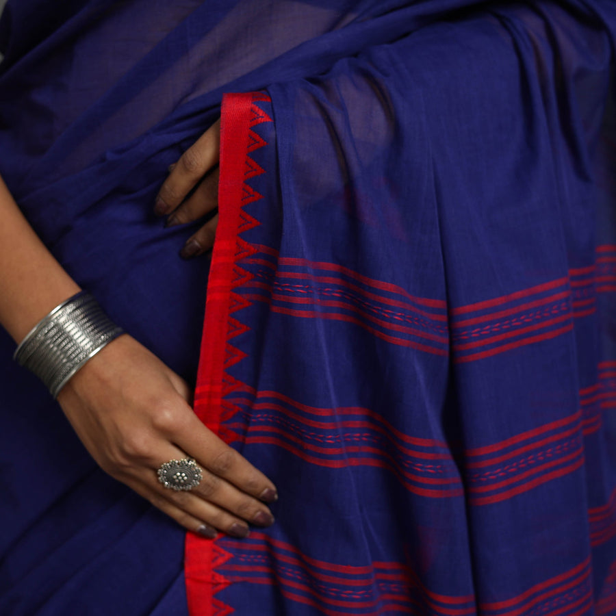 Begampuri sari is woven in a balanced texture with contrasting edges in red, black, purple, and orange and accented with cut edges. It is woven with various stripes and dyed cotton yarns from narrow edge to wide edge.