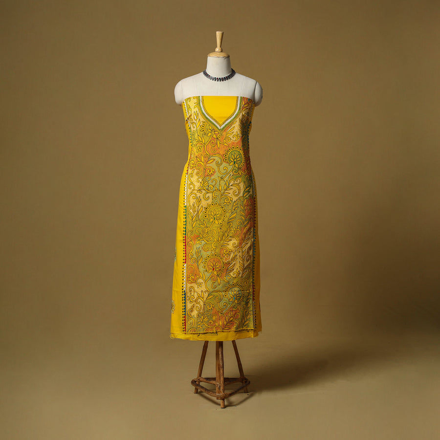 Kantha hand embroidery unstitched cotton kurta material thoughtfully created by skilled artisans of West Bengal.This kurta material sowcases each hand embroidered detail reflects the region’s rich cultural heritage with a modern appeal. The embroidery features motifs inspired by rural life, folk tales, mythological stories, flowers, leaves, animals, and geometric patterns. Comfortable and versatile, this fabric is ideal for crafting a kurta that feels elegant yet deeply rooted in tradition.