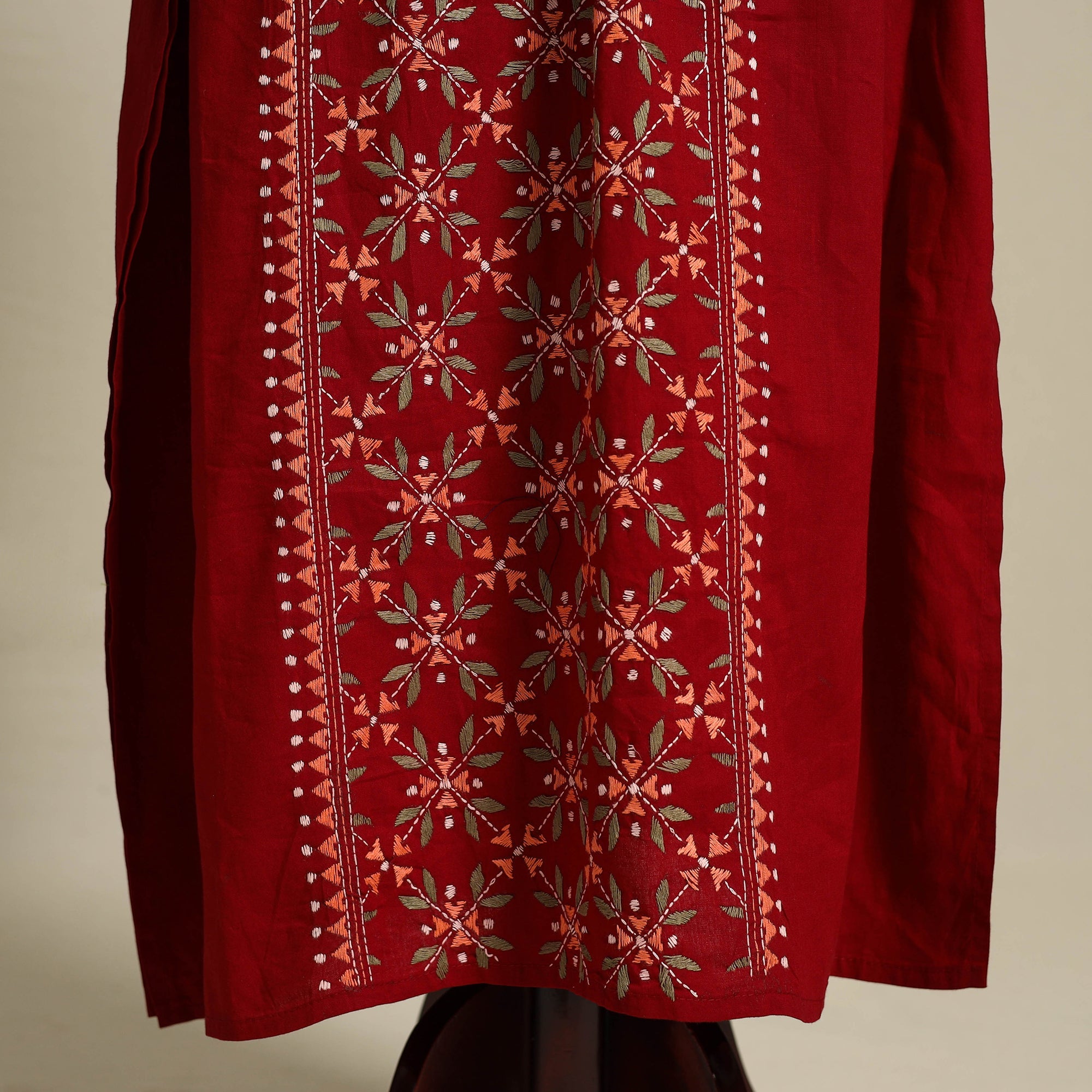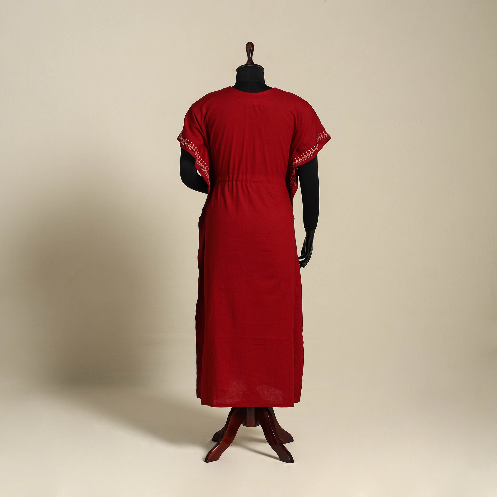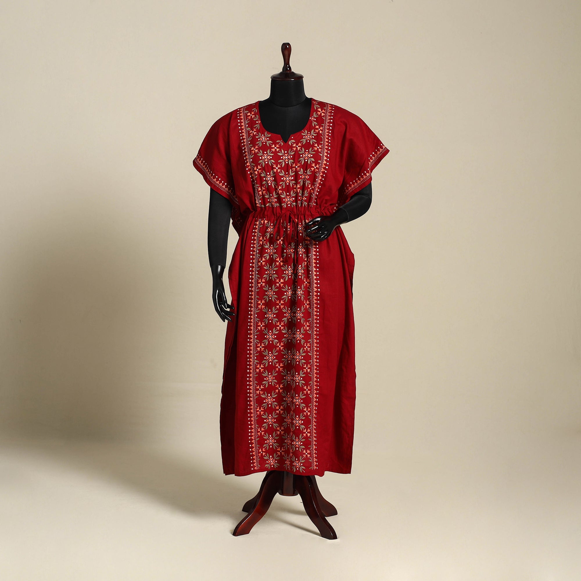 Discover the elegance of Bengal's heritage with this fine-quality maroon pure cotton long kaftan, intricately hand-embroidered using the traditional kantha technique. Crafted by skilled women artisans of West Bengal, the running stitches form detailed motifs that reflect cultural stories and daily life. The kaftan features a relaxed ankle-length cut with flowing sleeves and an adjustable drawstring waist for a personalized fit. Designed with modern aesthetics and timeless comfort, this easy-fitting silhouette lets you move freely, ideal for lounging, travel, or casual daywear.