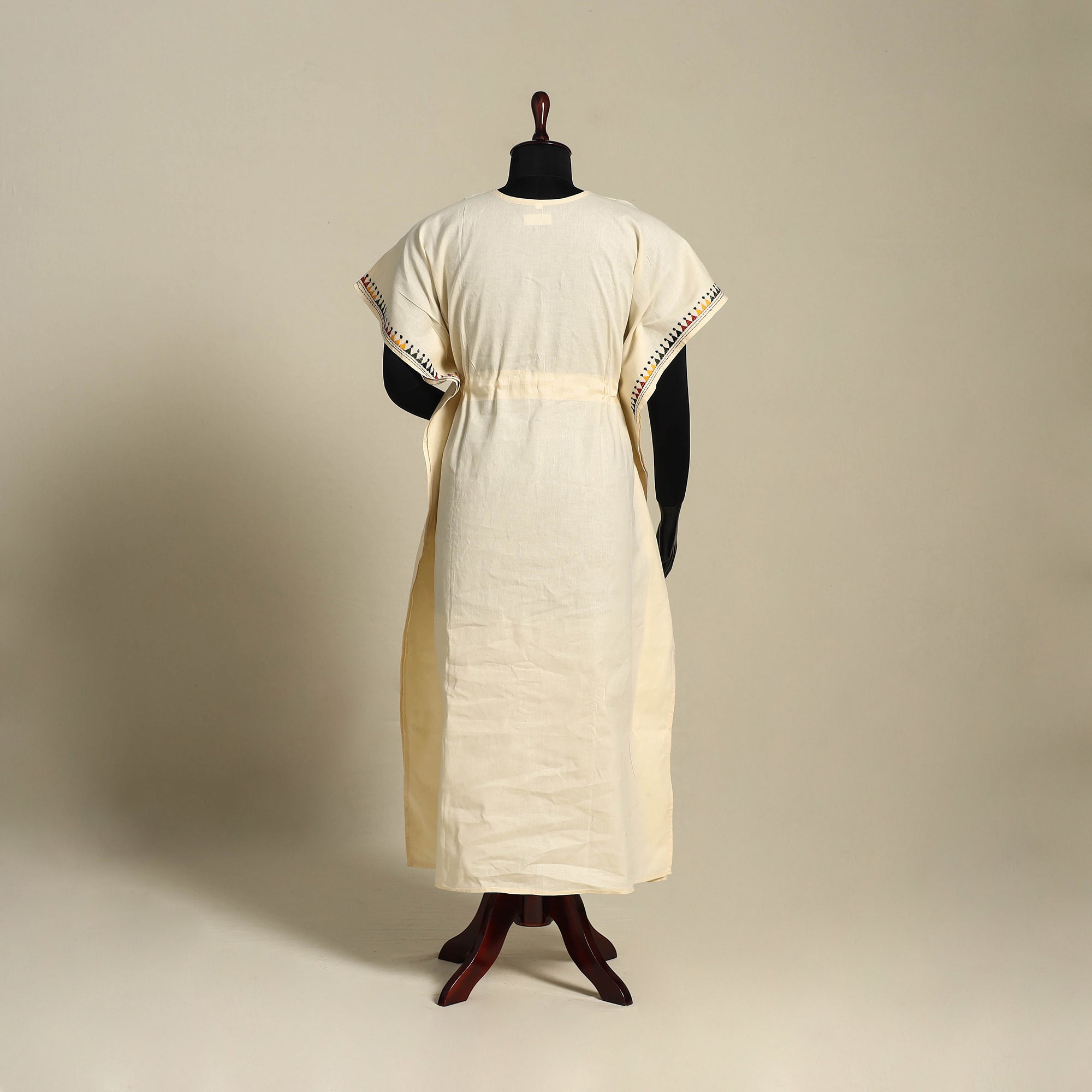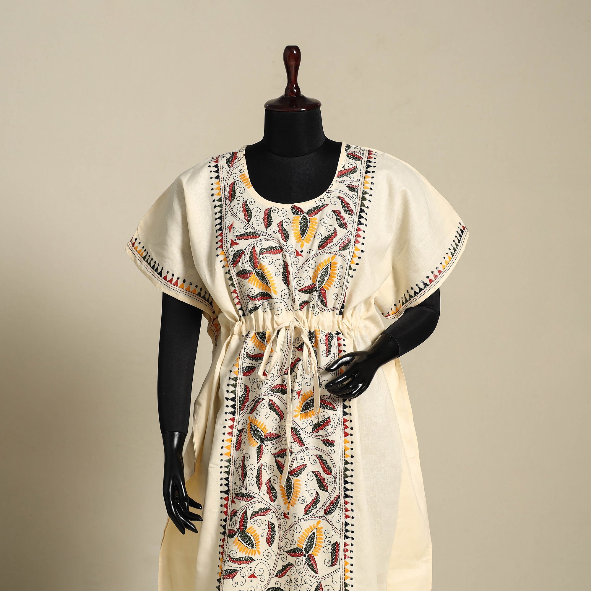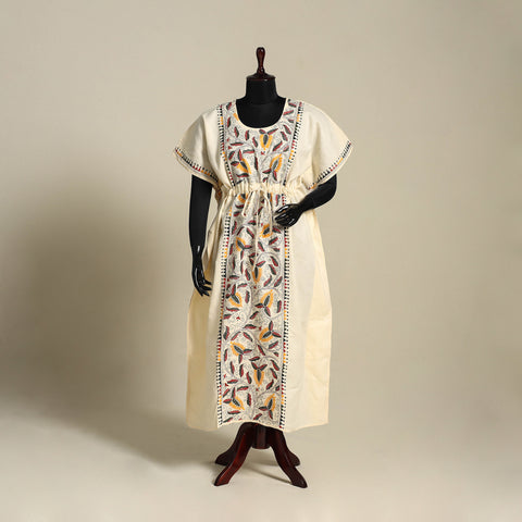 Discover the elegance of Bengal's heritage with this fine-quality beige pure cotton long kaftan, intricately hand-embroidered using the traditional kantha technique. Crafted by skilled women artisans of West Bengal, the running stitches form detailed motifs that reflect cultural stories and daily life. The kaftan features a relaxed ankle-length cut with flowing sleeves and an adjustable drawstring waist for a personalized fit. Designed with modern aesthetics and timeless comfort, this easy-fitting silhouette lets you move freely, ideal for lounging, travel, or casual daywear.