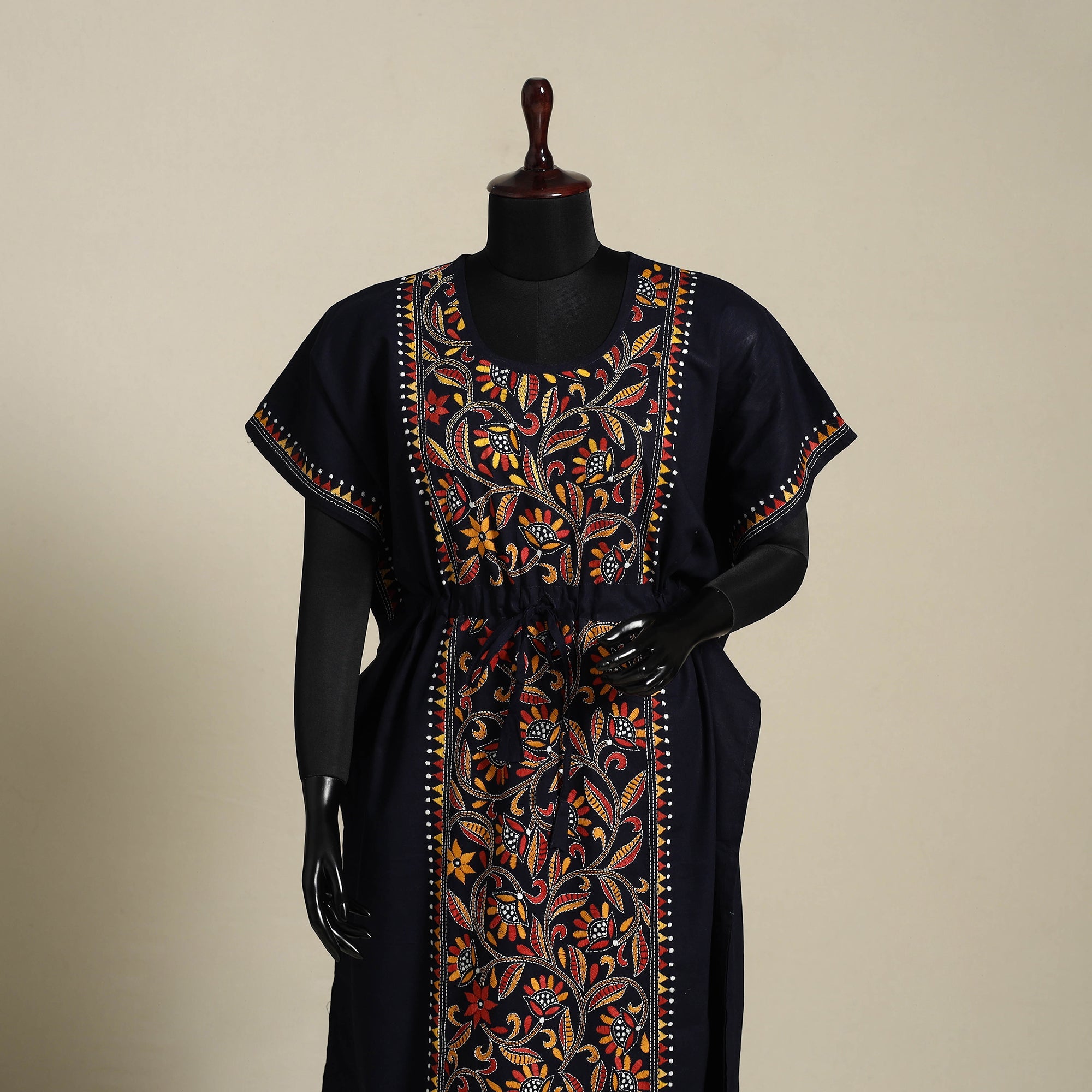 | Material | Discover the elegance of Bengal's heritage with this fine-quality black pure cotton long kaftan, intricately hand-embroidered using the traditional kantha technique. Crafted by skilled women artisans of West Bengal, the running stitches form detailed motifs that reflect cultural stories and daily life. The kaftan features a relaxed ankle-length cut with flowing sleeves and an adjustable drawstring waist for a personalized fit. Designed with modern aesthetics and timeless comfort, this easy-fitting silhouette lets you move freely, ideal for lounging, travel, or casual daywear. |