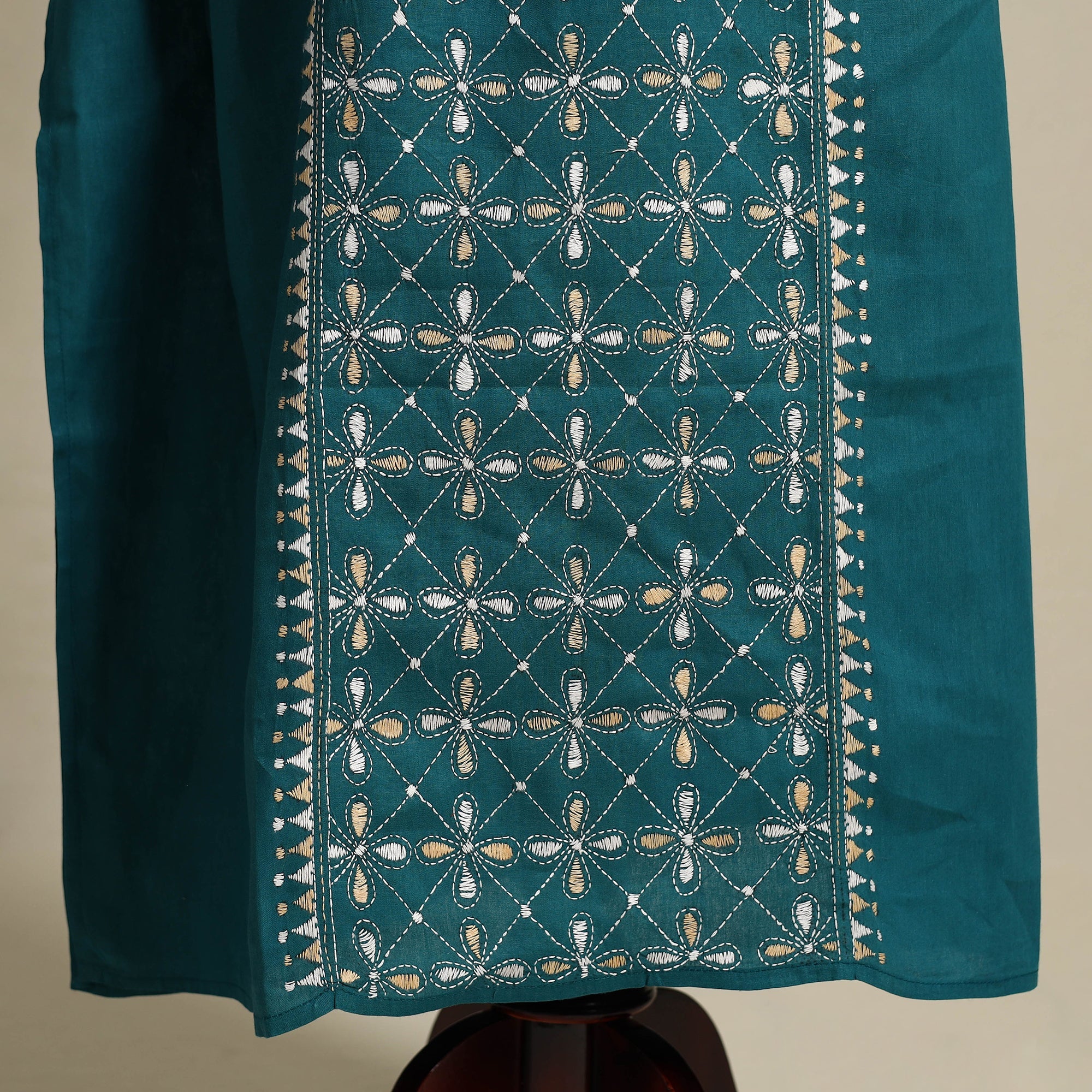 Discover the elegance of Bengal's heritage with this fine-quality green pure cotton long kaftan, intricately hand-embroidered using the traditional kantha technique. Crafted by skilled women artisans of West Bengal, the running stitches form detailed motifs that reflect cultural stories and daily life. The kaftan features a relaxed ankle-length cut with flowing sleeves and an adjustable drawstring waist for a personalized fit. Designed with modern aesthetics and timeless comfort, this easy-fitting silhouette lets you move freely, ideal for lounging, travel, or casual daywear.