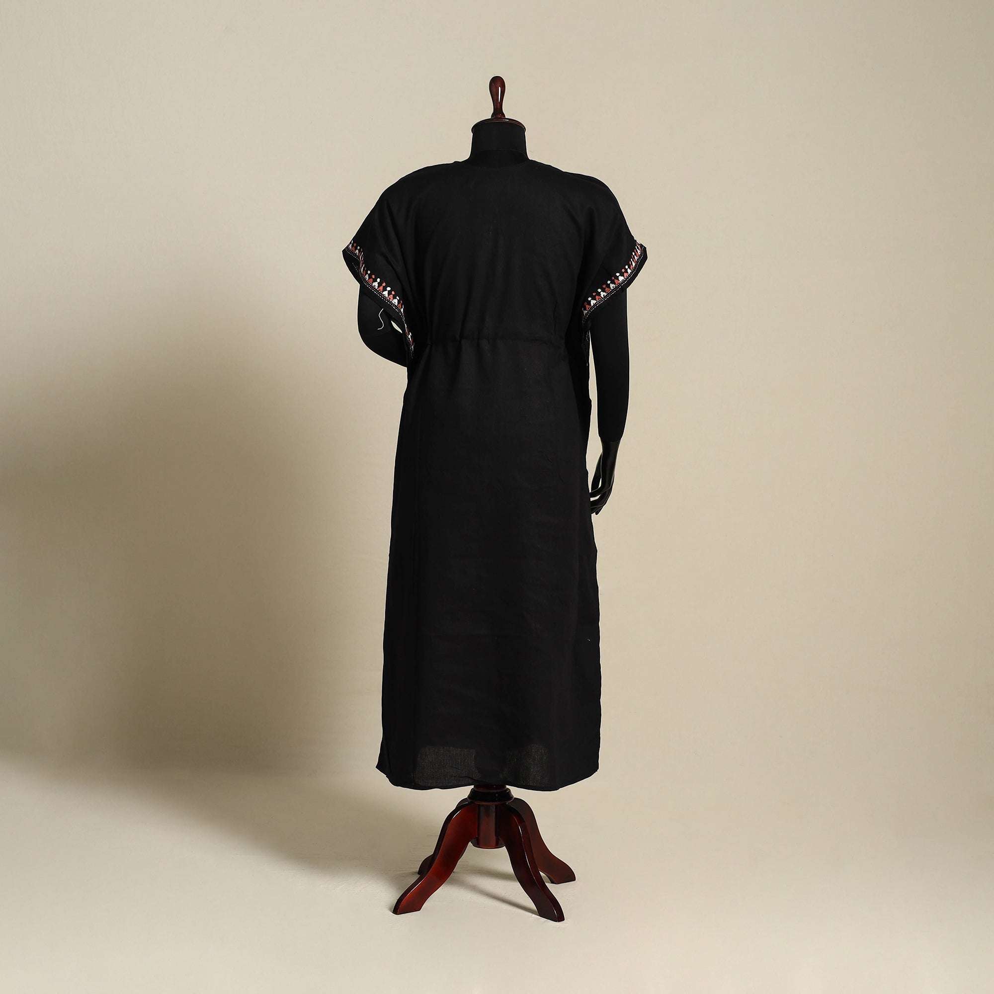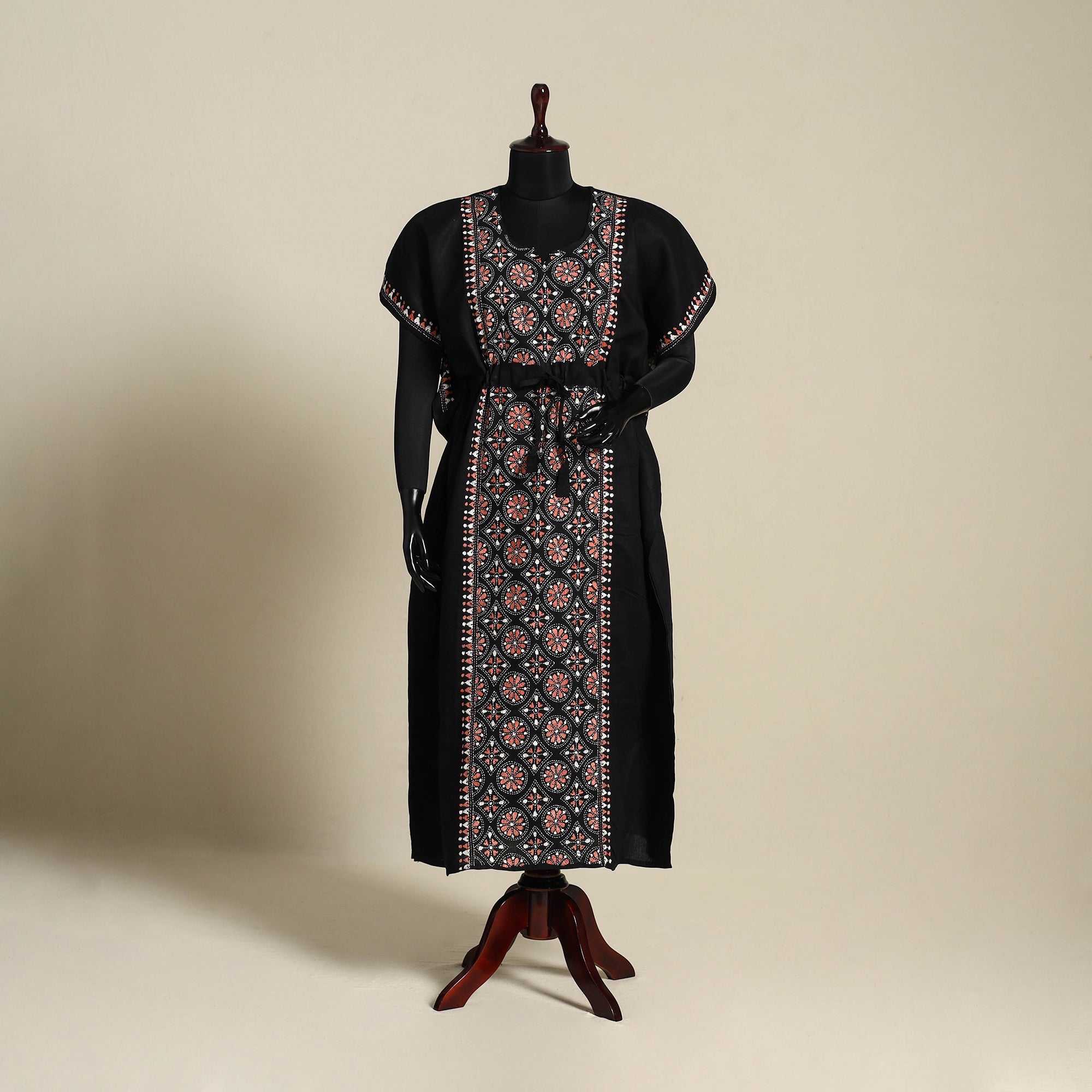 Discover the elegance of Bengal's heritage with this fine-quality black pure cotton long kaftan, intricately hand-embroidered using the traditional kantha technique. Crafted by skilled women artisans of West Bengal, the running stitches form detailed motifs that reflect cultural stories and daily life. The kaftan features a relaxed ankle-length cut with flowing sleeves and an adjustable drawstring waist for a personalized fit. Designed with modern aesthetics and timeless comfort, this easy-fitting silhouette lets you move freely, ideal for lounging, travel, or casual daywear.