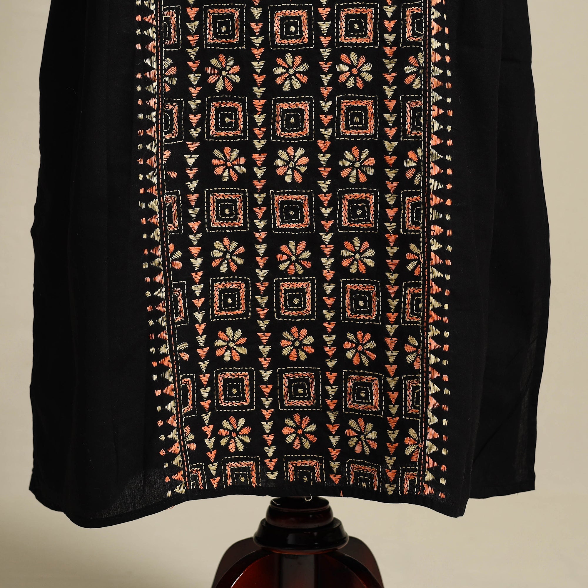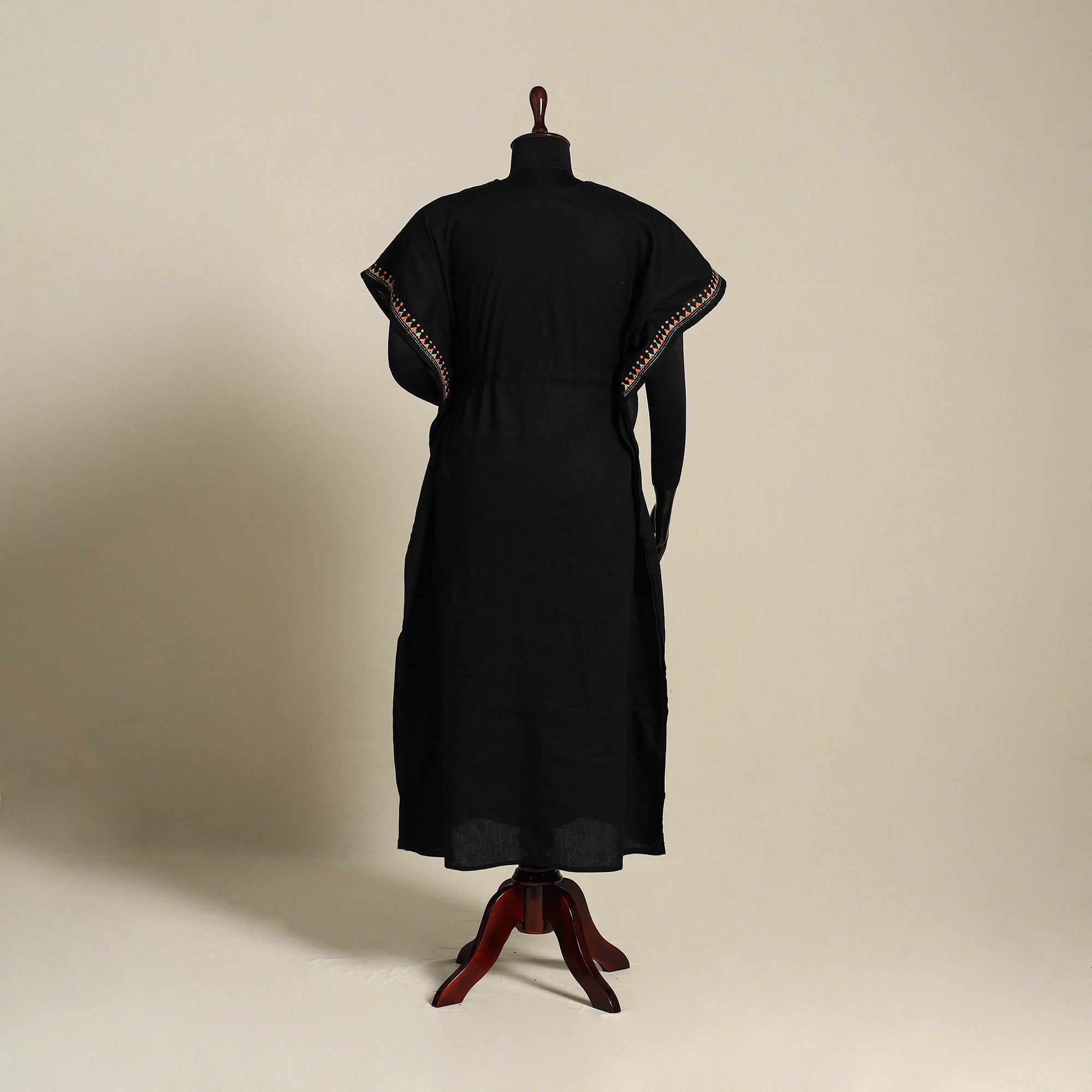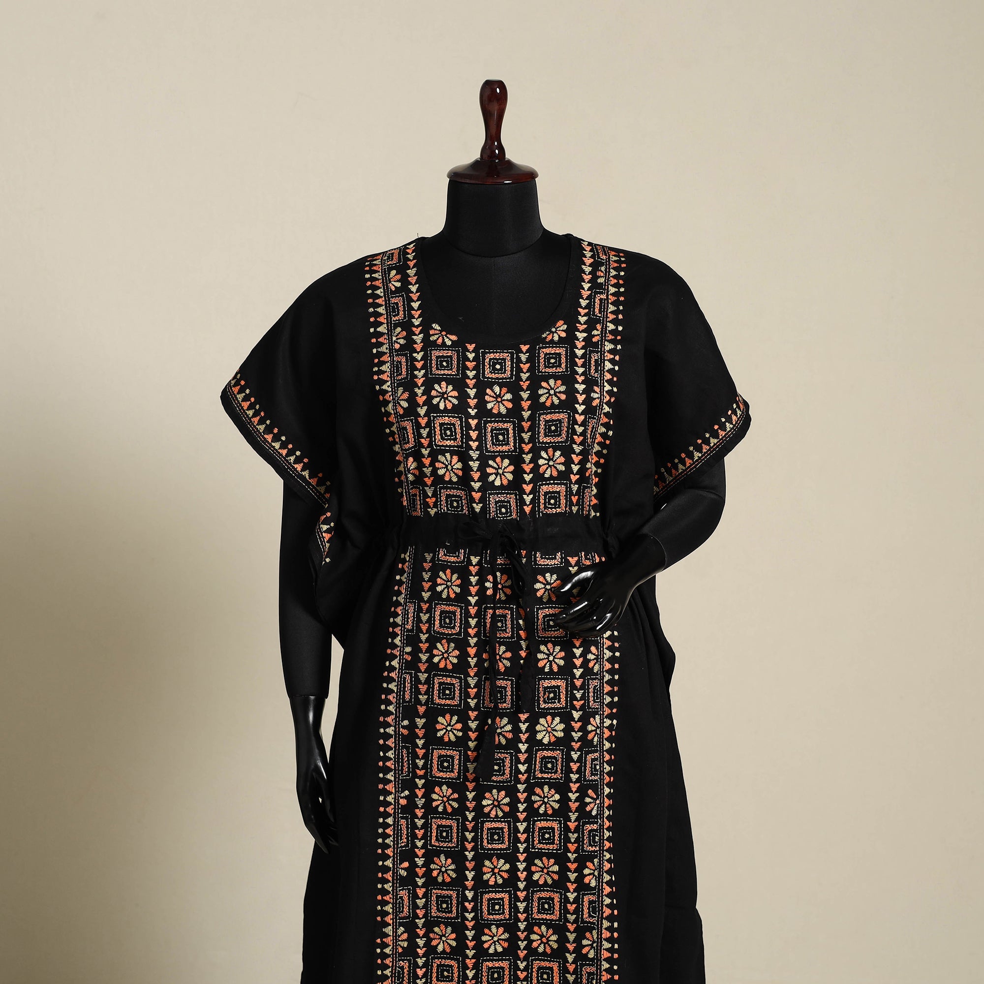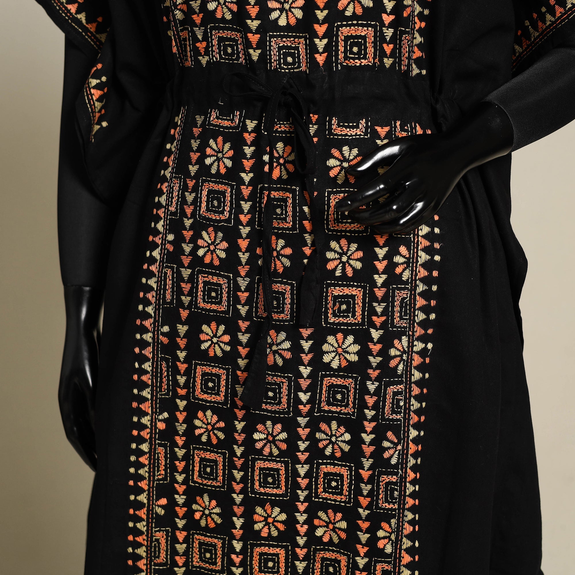 Discover the elegance of Bengal's heritage with this fine-quality black pure cotton long kaftan, intricately hand-embroidered using the traditional kantha technique. Crafted by skilled women artisans of West Bengal, the running stitches form detailed motifs that reflect cultural stories and daily life. The kaftan features a relaxed ankle-length cut with flowing sleeves and an adjustable drawstring waist for a personalized fit. Designed with modern aesthetics and timeless comfort, this easy-fitting silhouette lets you move freely, ideal for lounging, travel, or casual daywear.