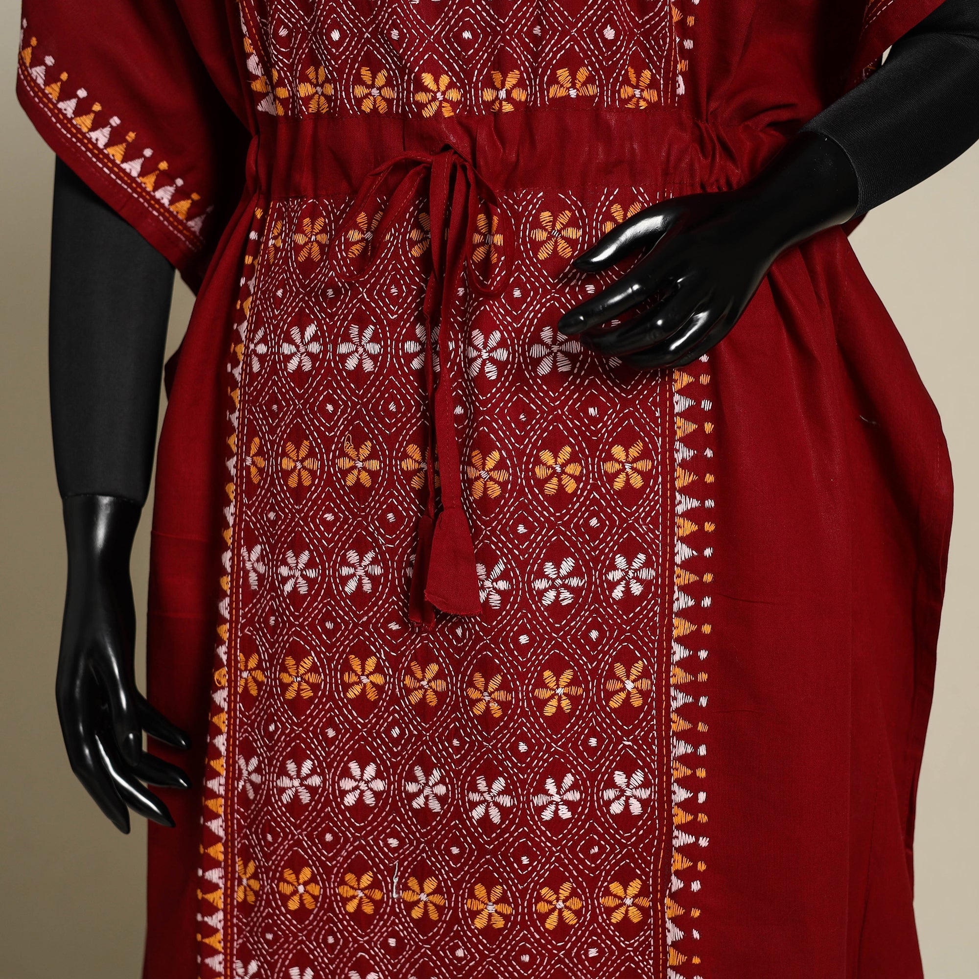 Discover the elegance of Bengal's heritage with this fine-quality maroon pure cotton long kaftan, intricately hand-embroidered using the traditional kantha technique. Crafted by skilled women artisans of West Bengal, the running stitches form detailed motifs that reflect cultural stories and daily life. The kaftan features a relaxed ankle-length cut with flowing sleeves and an adjustable drawstring waist for a personalized fit. Designed with modern aesthetics and timeless comfort, this easy-fitting silhouette lets you move freely, ideal for lounging, travel, or casual daywear.