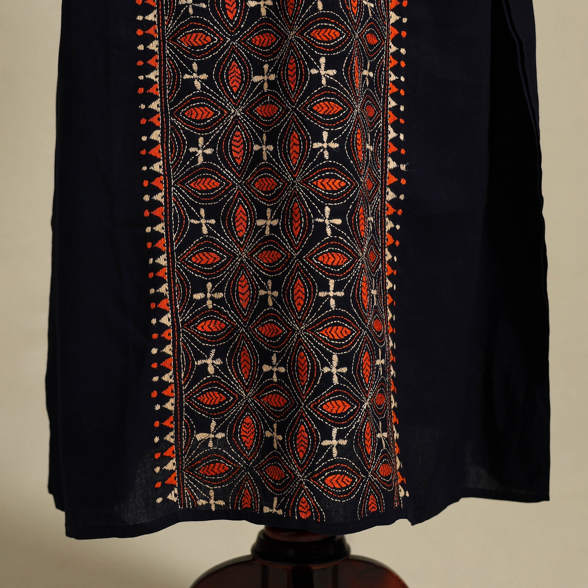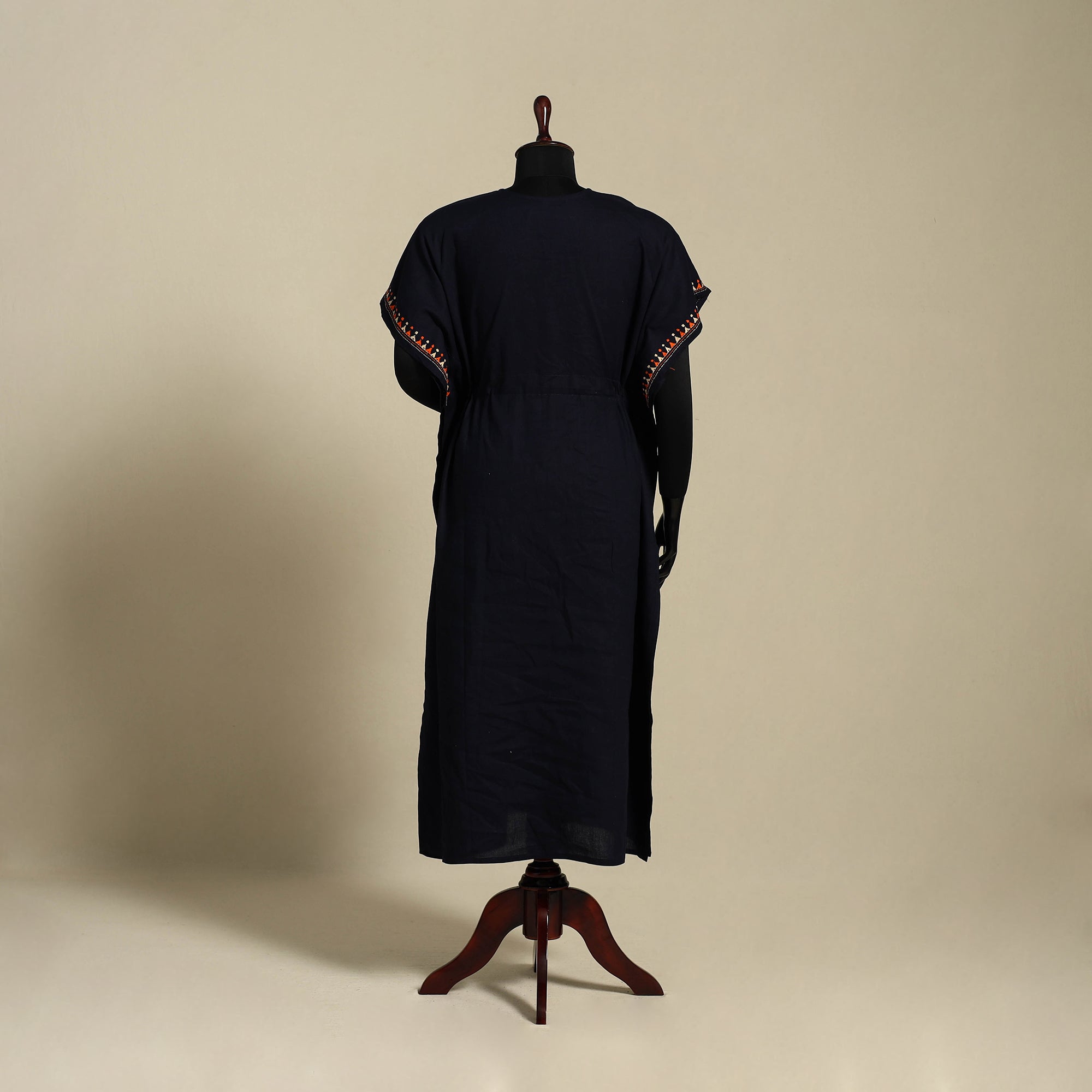 Discover the elegance of Bengal's heritage with this fine-quality black pure cotton long kaftan, intricately hand-embroidered using the traditional kantha technique. Crafted by skilled women artisans of West Bengal, the running stitches form detailed motifs that reflect cultural stories and daily life. The kaftan features a relaxed ankle-length cut with flowing sleeves and an adjustable drawstring waist for a personalized fit. Designed with modern aesthetics and timeless comfort, this easy-fitting silhouette lets you move freely, ideal for lounging, travel, or casual daywear.