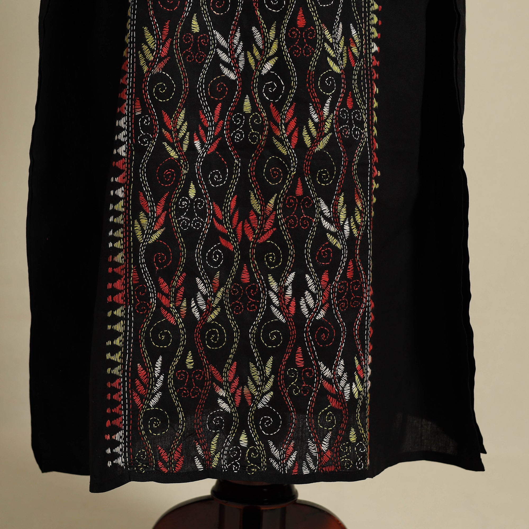 Discover the elegance of Bengal's heritage with this fine-quality black pure cotton long kaftan, intricately hand-embroidered using the traditional kantha technique. Crafted by skilled women artisans of West Bengal, the running stitches form detailed motifs that reflect cultural stories and daily life. The kaftan features a relaxed ankle-length cut with flowing sleeves and an adjustable drawstring waist for a personalized fit. Designed with modern aesthetics and timeless comfort, this easy-fitting silhouette lets you move freely, ideal for lounging, travel, or casual daywear.