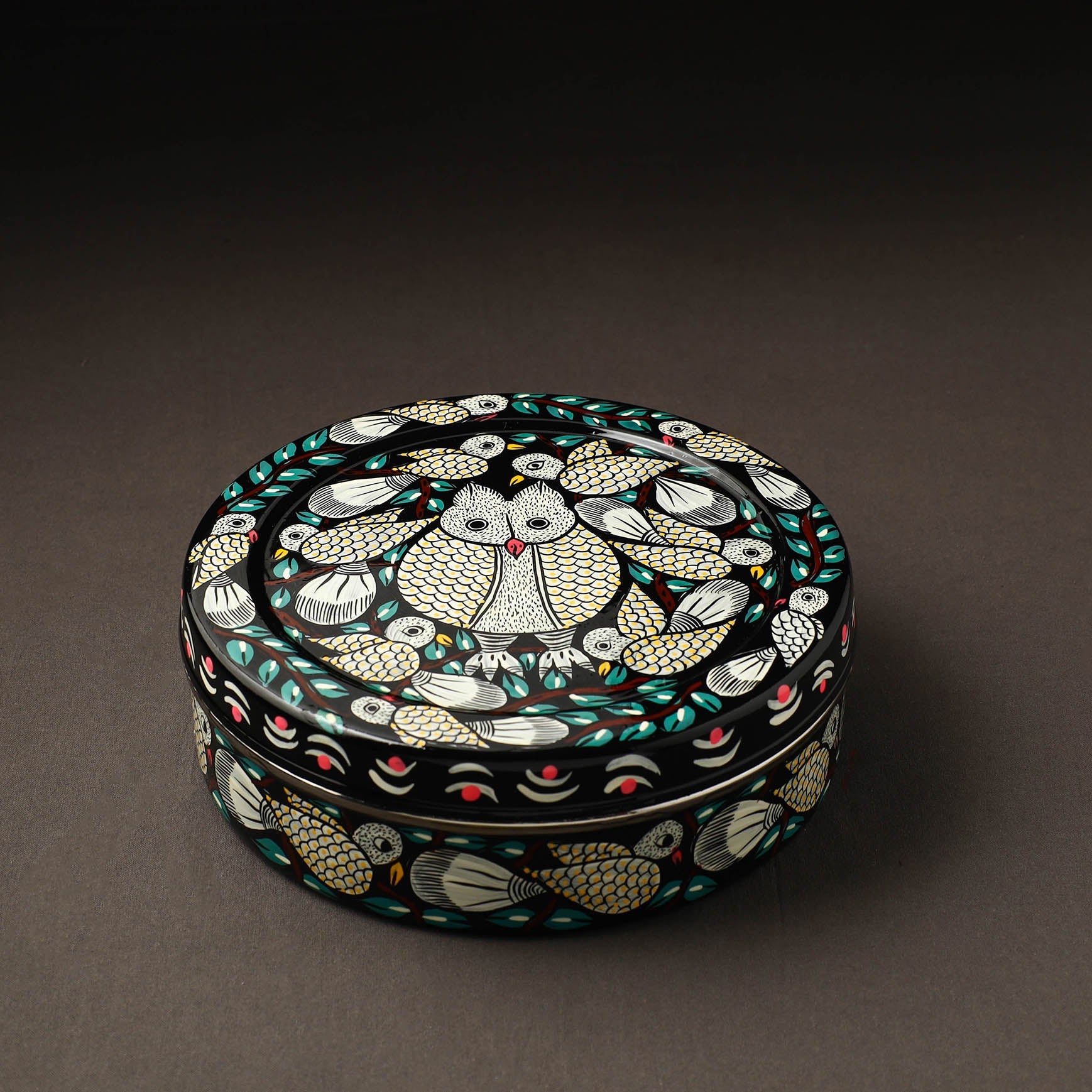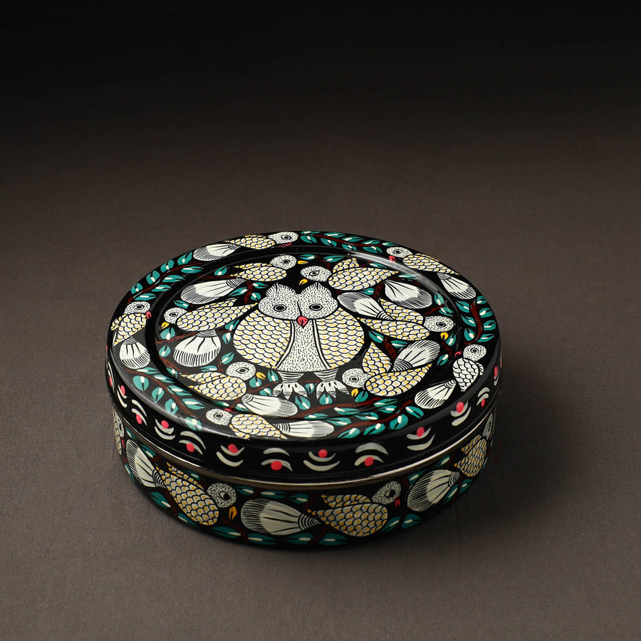 Brighten up your dining space with this black bengal patua hand painted stainless steel casserole. Meticulously crafted by artisans, this roti box not only keeps your rotis warm but also celebrates rich folk traditions. Built from sturdy stainless steel and painted with waterproof oil-based colors, it offers both charm and functionality. Ideal for daily use or festive occasions.