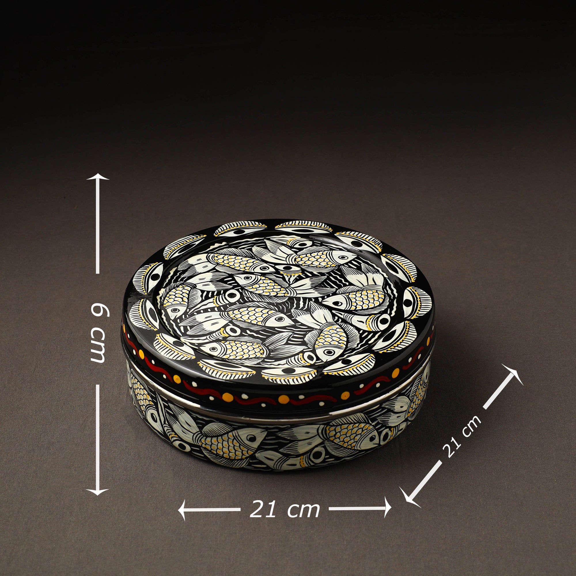 Brighten up your dining space with this black bengal patua hand painted stainless steel casserole. Meticulously crafted by artisans, this roti box not only keeps your rotis warm but also celebrates rich folk traditions. Built from sturdy stainless steel and painted with waterproof oil-based colors, it offers both charm and functionality. Ideal for daily use or festive occasions.