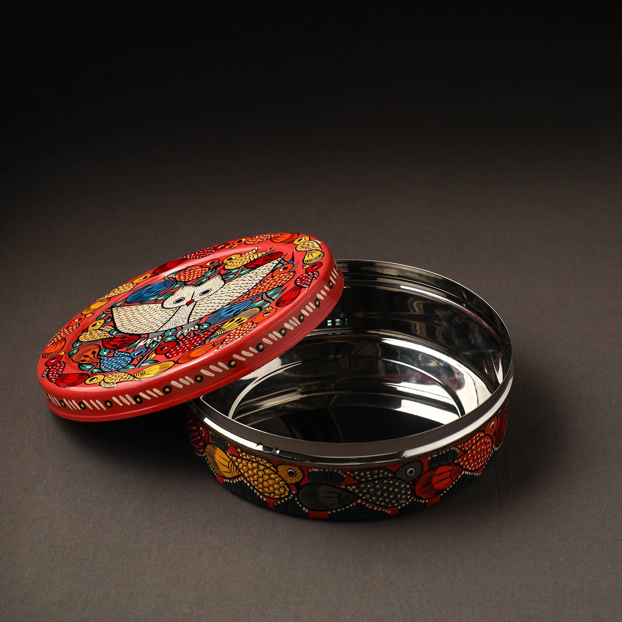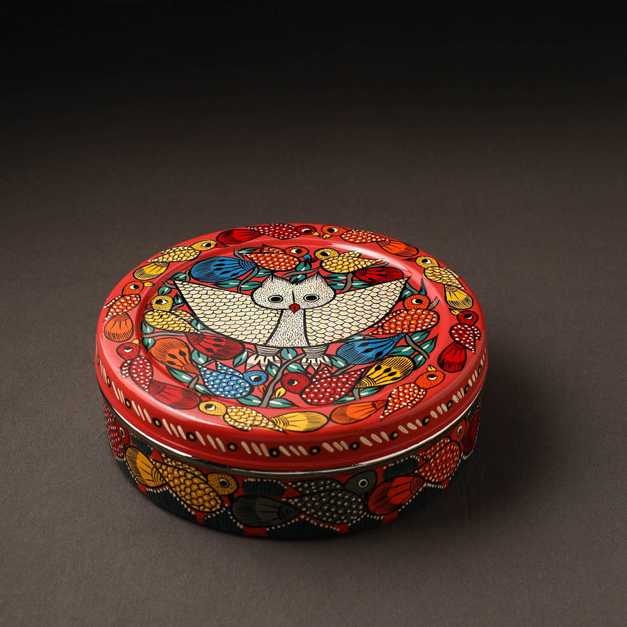 Brighten up your dining space with this red bengal patua hand painted stainless steel casserole. Meticulously crafted by artisans, this roti box not only keeps your rotis warm but also celebrates rich folk traditions. Built from sturdy stainless steel and painted with waterproof oil-based colors, it offers both charm and functionality. Ideal for daily use or festive occasions.