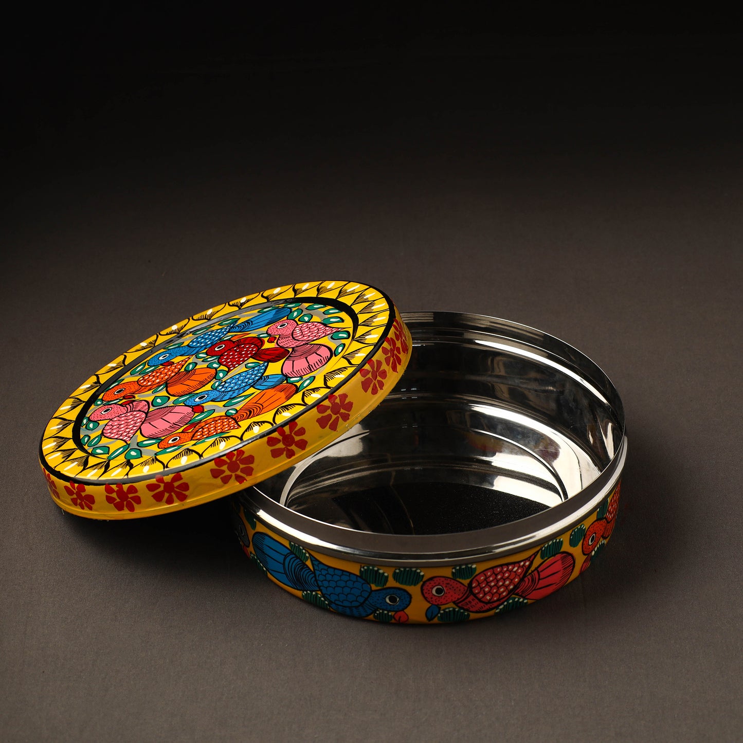 Brighten up your dining space with this yellow bengal patua hand painted stainless steel casserole. Meticulously crafted by artisans, this roti box not only keeps your rotis warm but also celebrates rich folk traditions. Built from sturdy stainless steel and painted with waterproof oil-based colors, it offers both charm and functionality. Ideal for daily use or festive occasions.