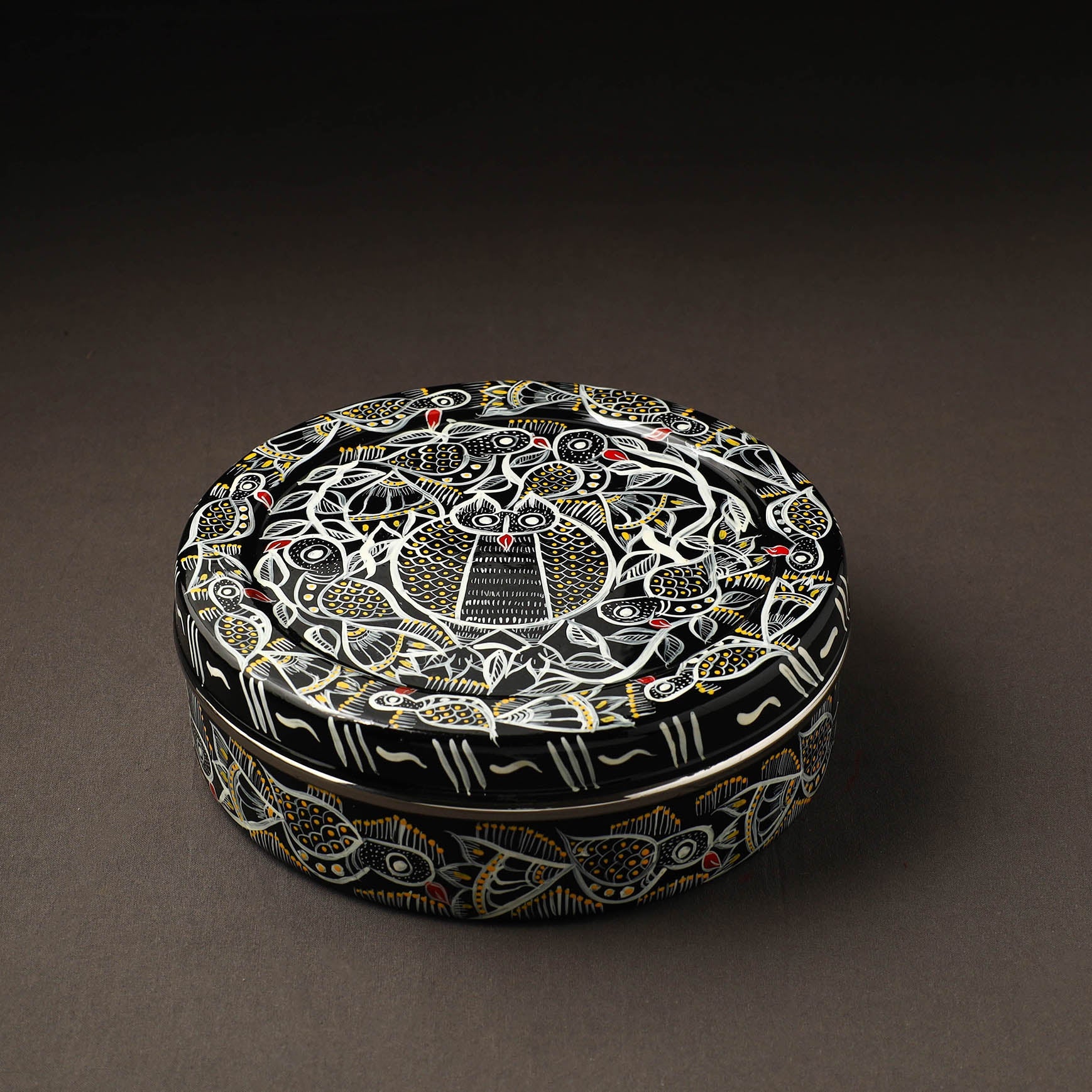 Brighten up your dining space with this black bengal patua hand painted stainless steel casserole. Meticulously crafted by artisans, this roti box not only keeps your rotis warm but also celebrates rich folk traditions. Built from sturdy stainless steel and painted with waterproof oil-based colors, it offers both charm and functionality. Ideal for daily use or festive occasions.