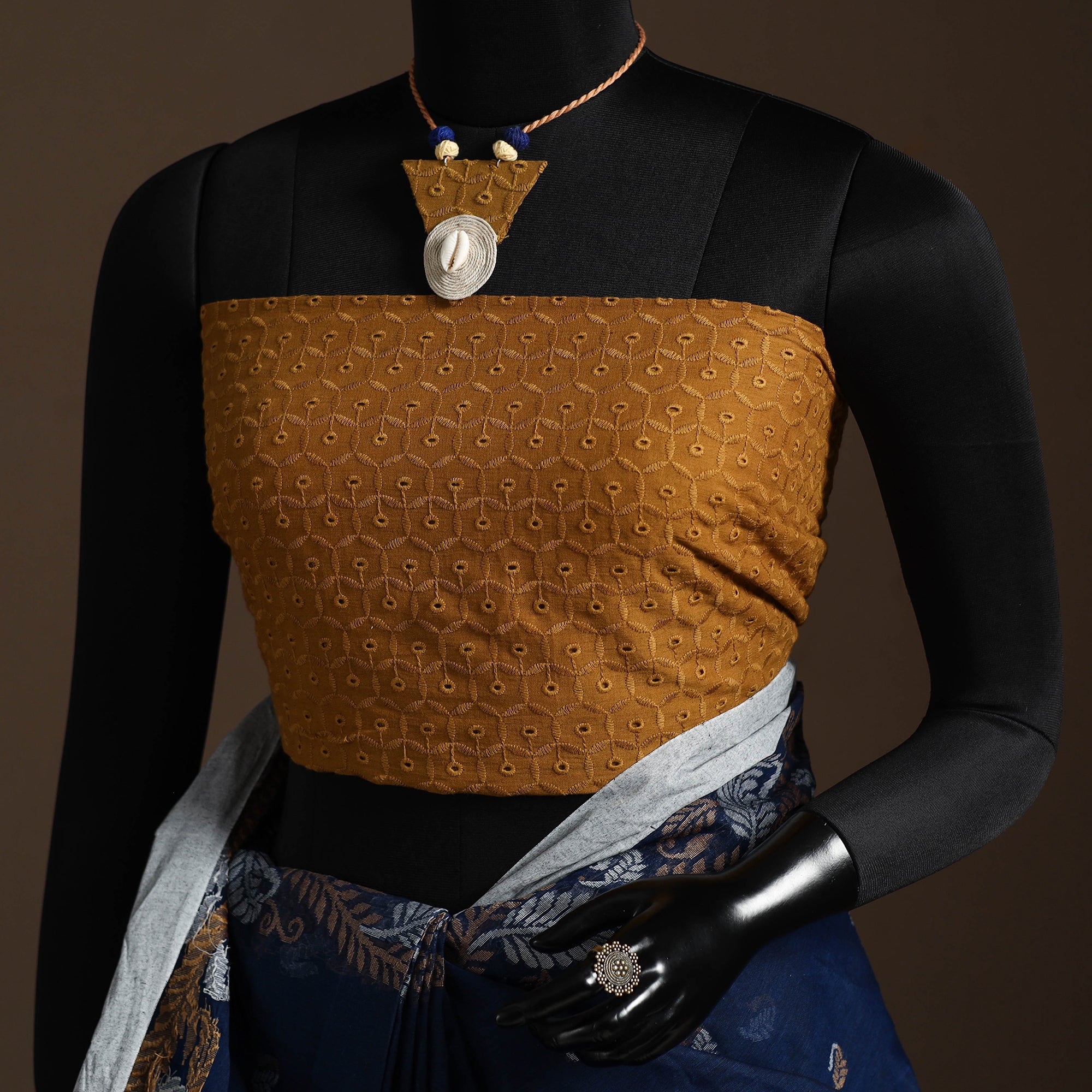 Experience the charm of traditional weaving with this blue cotton tant handloom saree, crafted by skilled artisans from Bengal. Adorned with woven borders and intricate floral and paisley motifs, the saree comes as a complete set including a hakoba embroidered unstitched blouse, a matching necklace and a pair of earrings. Worn during festivals and cultural gatherings, it carries a distinctive identity that adds elegance to every special occasion.