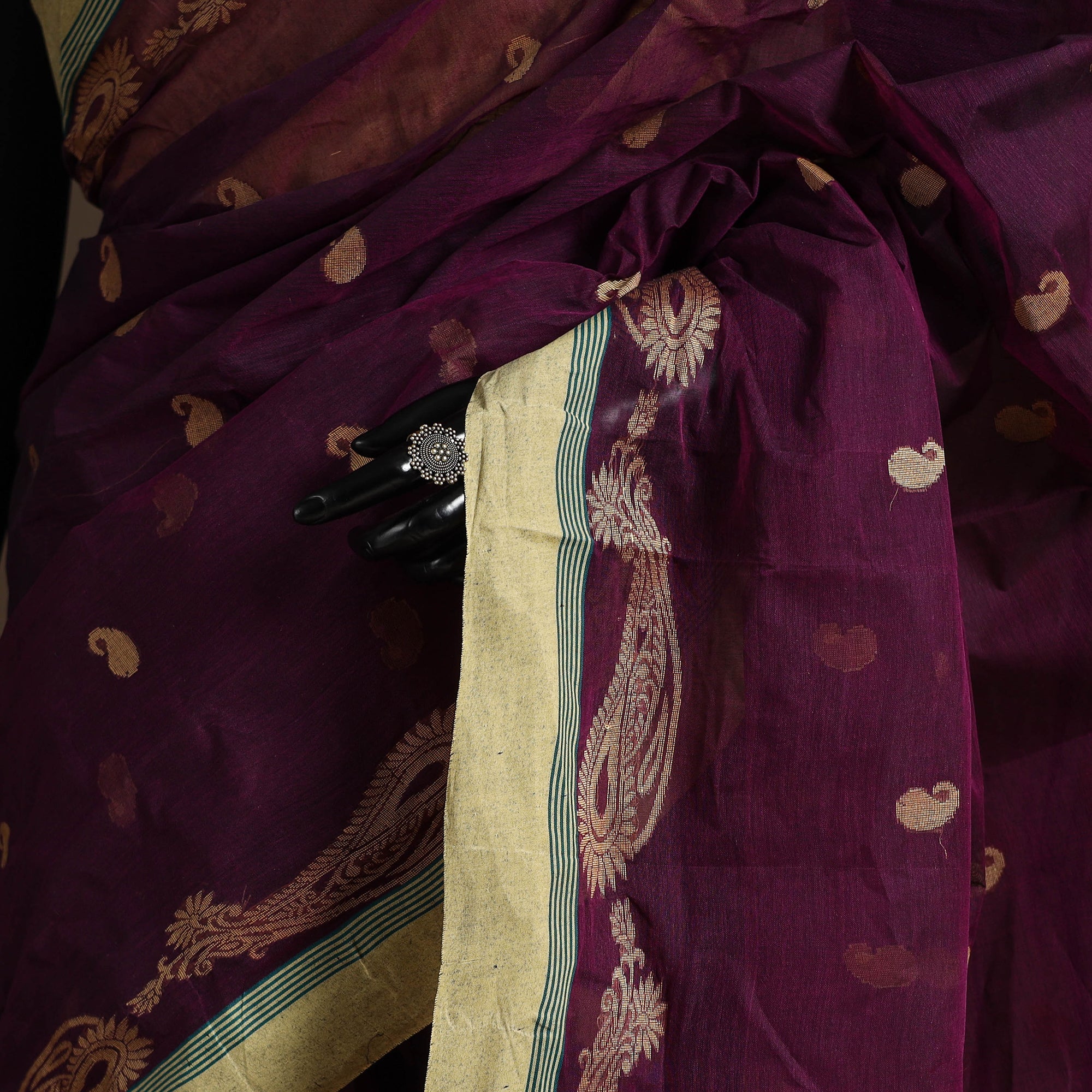 Experience the timeless beauty of traditional weaving with this purple handloom cotton tant saree, meticulously crafted by artisans from Bengal. Featuring elegant woven borders and delicate floral-paisley motifs, this saree set includes a jacquard weave unstitched blouse, a coordinating necklace, and earrings. Ideal for festivals and cultural occasions, it brings a graceful charm to every special moment.