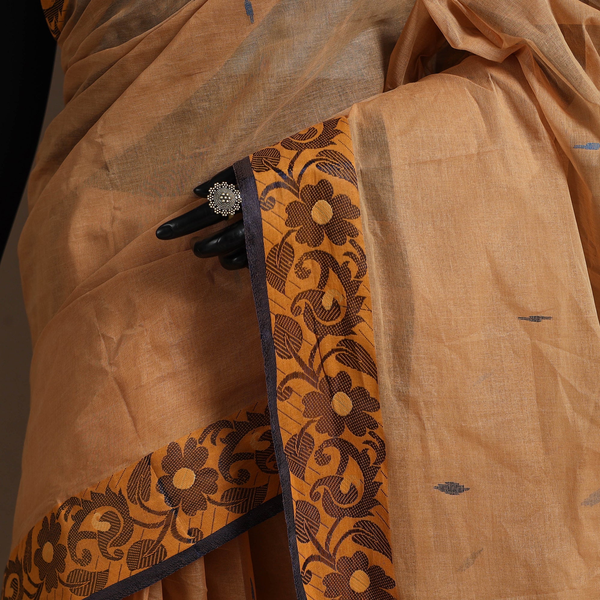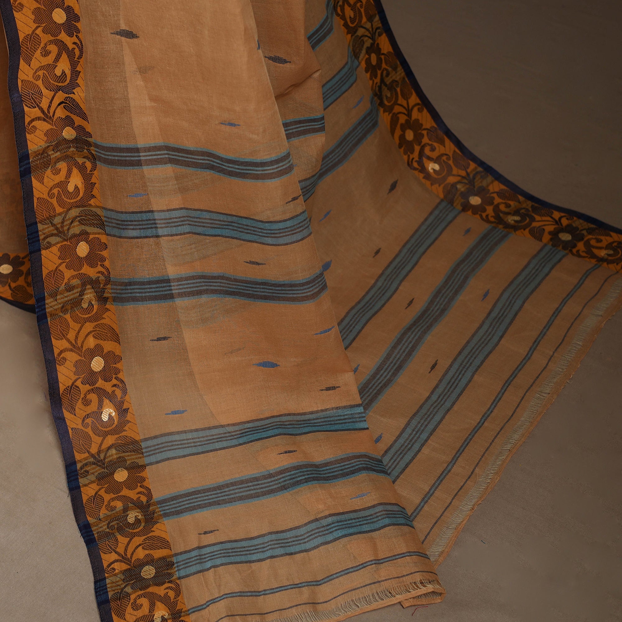 | Material | Experience the timeless beauty of traditional weaving with this brown handloom cotton tant saree, meticulously crafted by artisans from Bengal. Featuring elegant woven borders and delicate floral-paisley motifs, this saree set includes a jacquard weave unstitched blouse, a coordinating necklace, and earrings. Ideal for festivals and cultural occasions, it brings a graceful charm to every special moment.