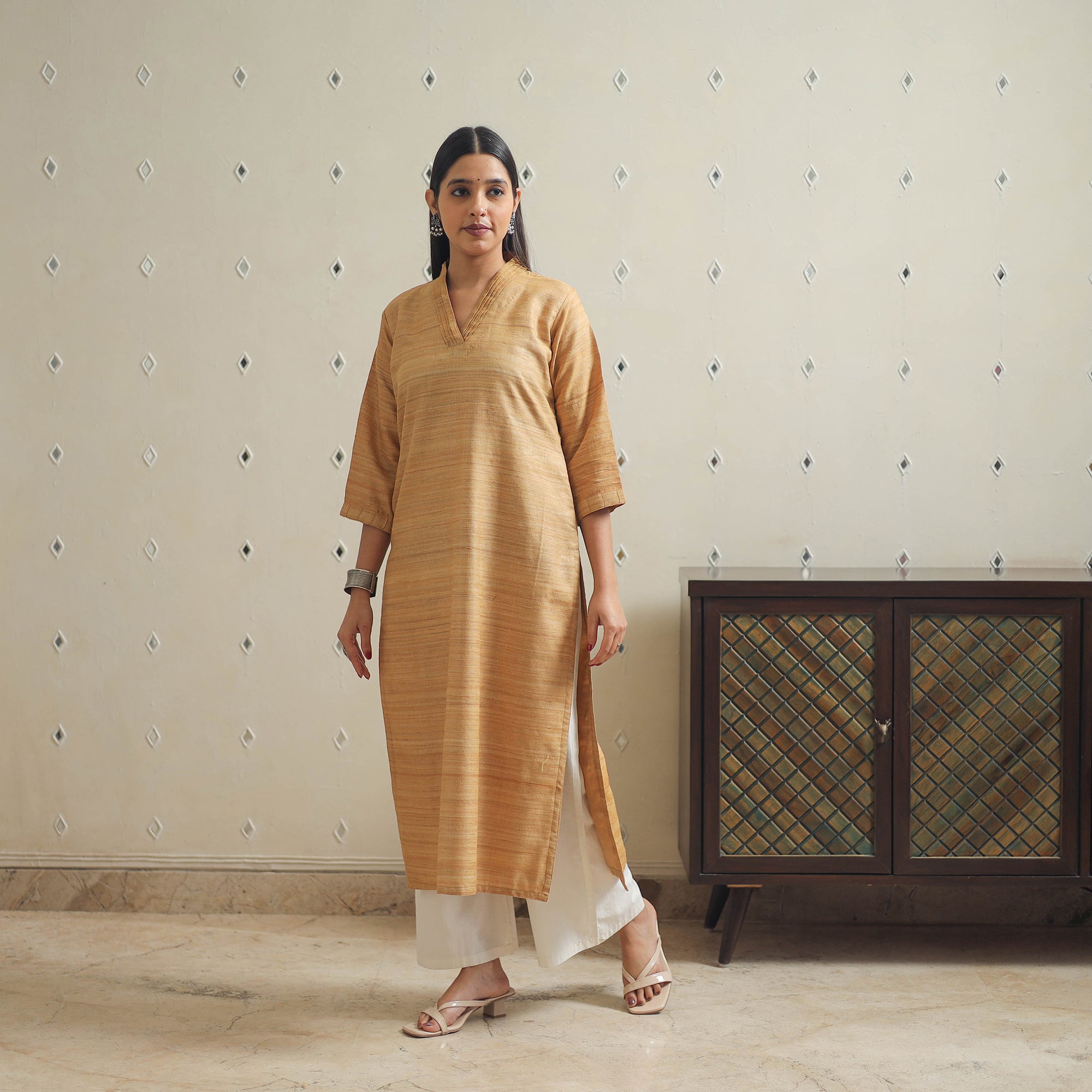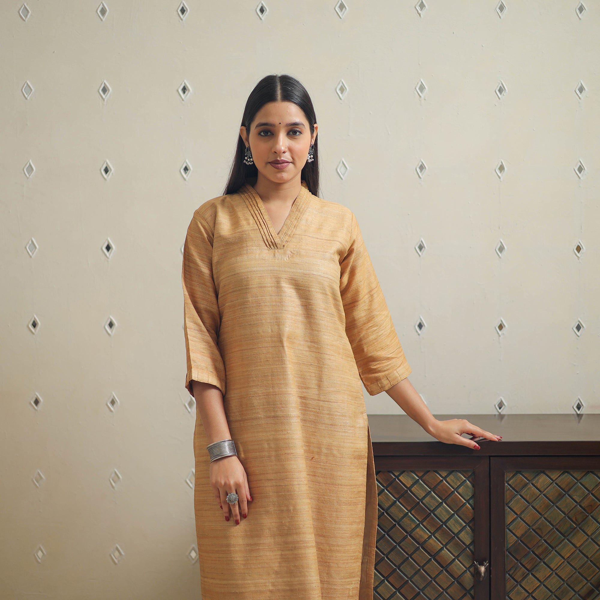 This beige bhagalpuri handwoven desi tussar silk plain kurta from Bhagalpur. Bhagalpur is also known as "silk city" of India. Featuring a convenient side pocket, it combines practicality with unmatched comfort. Perfect for daily wear or special occasions, this kurta adds a touch of sophistication to your wardrobe, blending tradition with modern functionality.