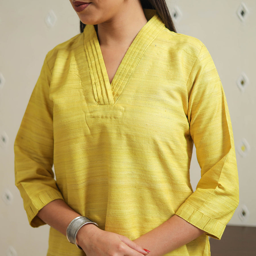 This yellow bhagalpuri handwoven desi tussar silk plain kurta from Bhagalpur. Bhagalpur is also known as "silk city" of India. Featuring a convenient side pocket, it combines practicality with unmatched comfort. Perfect for daily wear or special occasions, this kurta adds a touch of sophistication to your wardrobe, blending tradition with modern functionality.