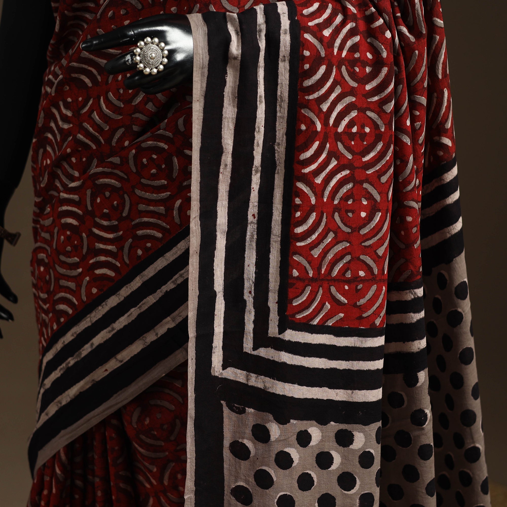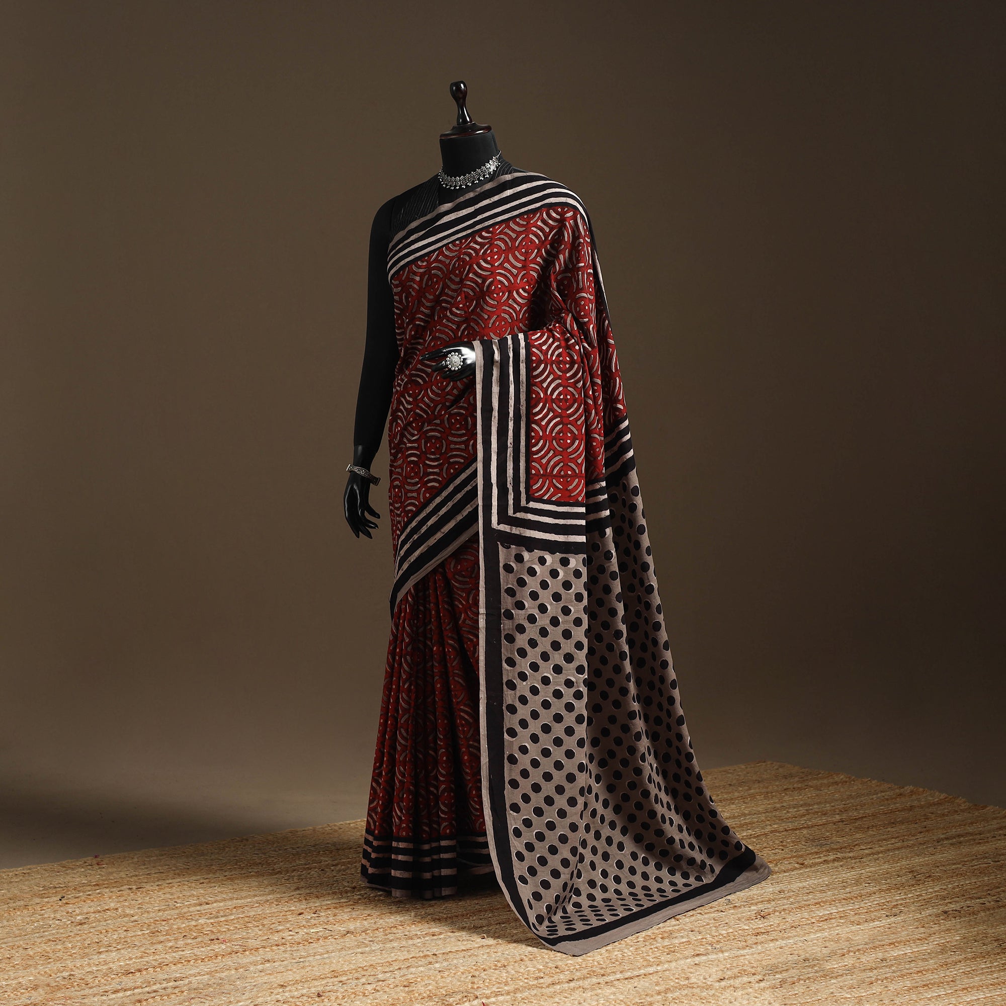 Handcrafted Maroon Bindaas art block print cotton saree, made for breathable comfort and everyday elegance. Naturally dyed and created by skilled artisans, it features intricate motifs that blend timeless tradition with a modern vibe. Whether you’re heading to a family get-together or enjoying a casual outing, this saree is a versatile essential that pairs heritage art with contemporary flair, fitting seamlessly into your daily wardrobe.