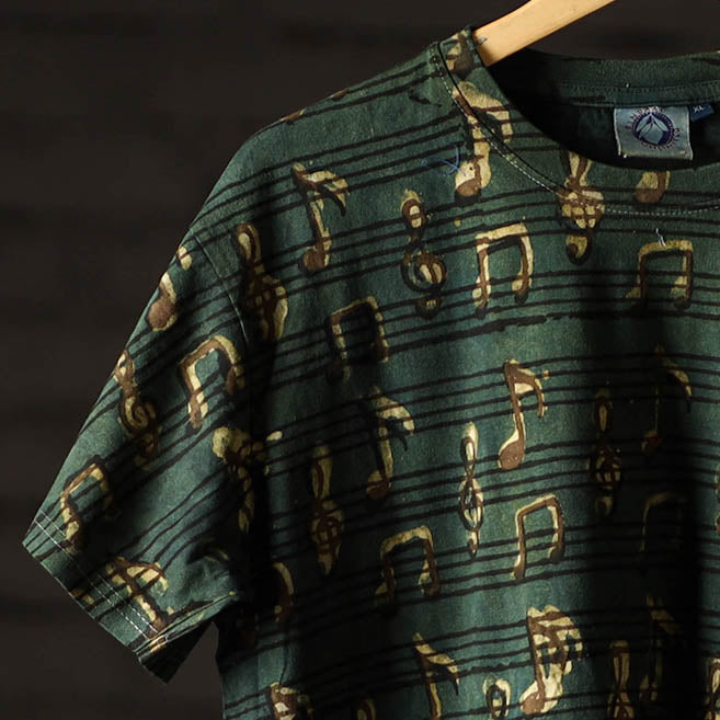 Celebrate artisanal heritage with this bindaas block art printed cotton unisex round neck t-shirt, crafted from natural dyed cotton using traditional techniques from Rajasthan. To make these t-shirts it takes: a hundred year old technique, 15-22 processes, 25-40 pairs of hands, 65 hours spread over, at least 12 days, a lot of sun and sand. Perfect for casual outings, relaxed weekends.