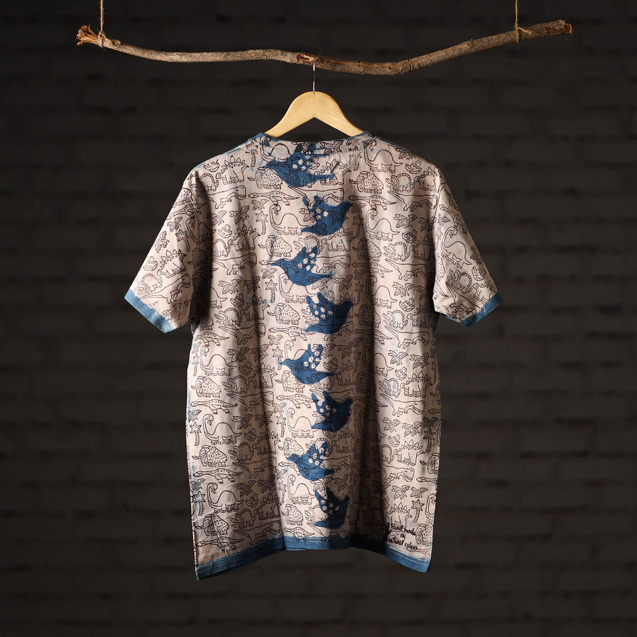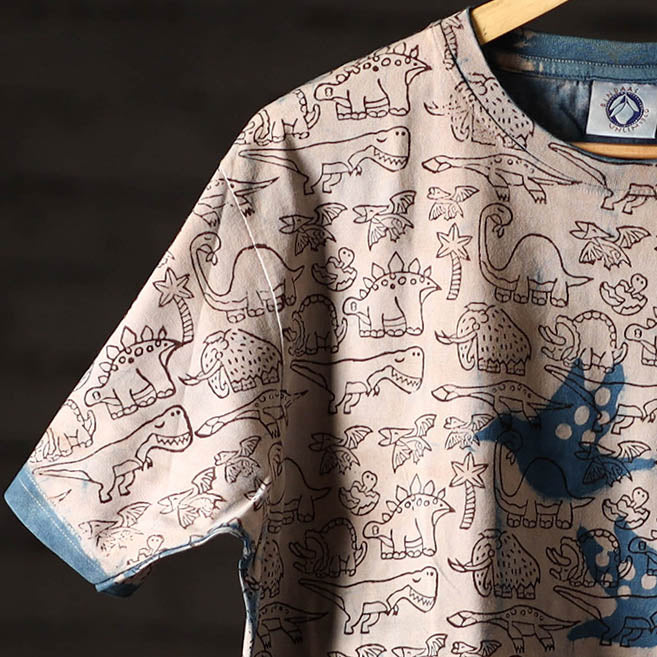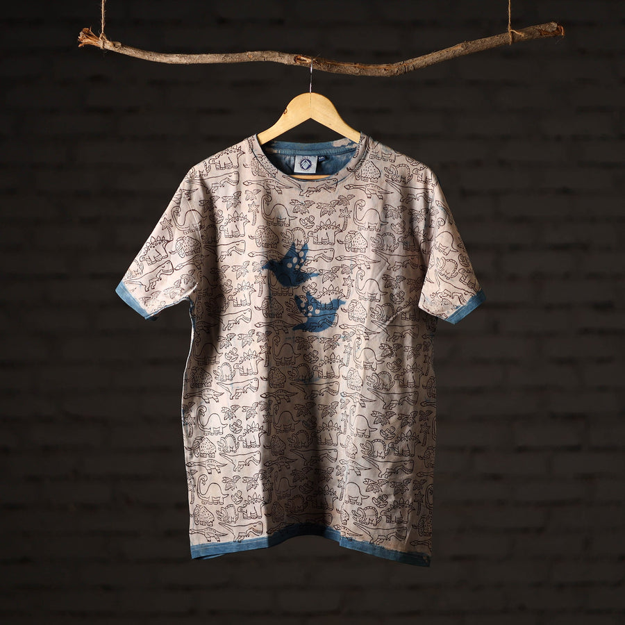 Celebrate artisanal heritage with this bindaas block art printed cotton unisex round neck t-shirt, crafted from natural dyed cotton using traditional techniques from Rajasthan. To make these t-shirts it takes: a hundred year old technique, 15-22 processes, 25-40 pairs of hands, 65 hours spread over, at least 12 days, a lot of sun and sand. Perfect for casual outings, relaxed weekends.