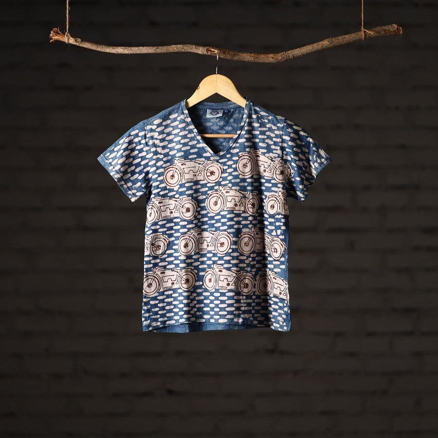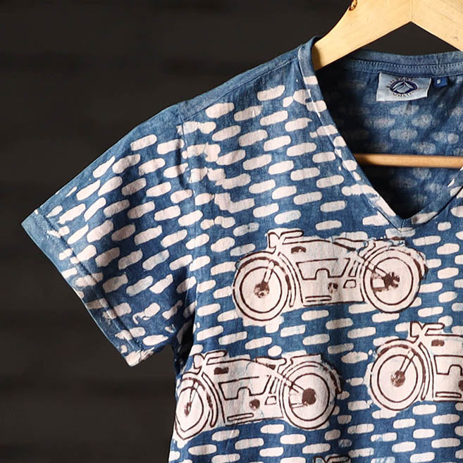 Celebrate artisanal heritage with this bindaas block art printed cotton women v neck t-shirt, crafted from natural dyed cotton using traditional techniques from Rajasthan. To make these t-shirts it takes: a hundred year old technique, 15-22 processes, 25-40 pairs of hands, 65 hours spread over, at least 12 days, a lot of sun and sand. Perfect for casual outings, relaxed weekends.