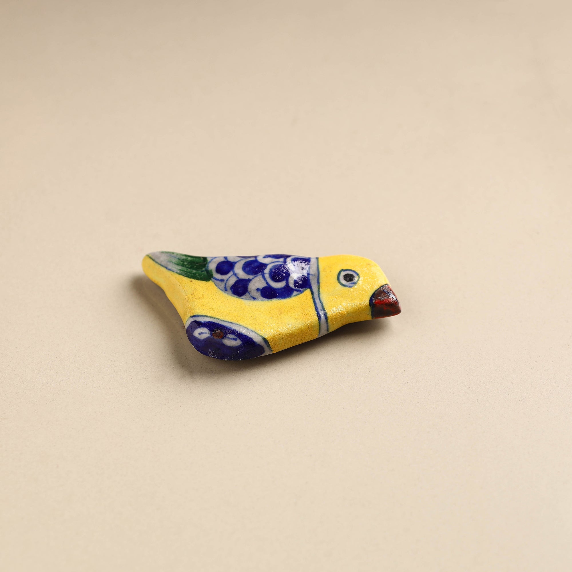 This original blue pottery ceramic tile yellow bird fridge magnet is handmade in Jaipur. This traditional craft, known for its vivid blue hues, is created using a unique clay-free mixture of quartz stone powder, powdered glass, Multani Mitti (Fuller's Earth), borax, gum and water. Blue pottery is widely recognized as a traditional craft of Jaipur, though it is Turko-Persian in origin. This magnet is perfect for home decor or gifting.