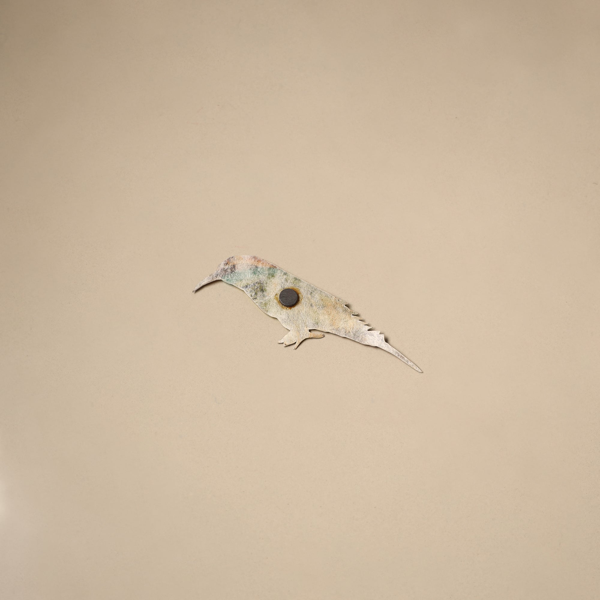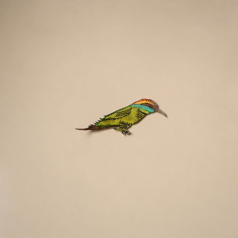 Green tholu bommalata leather puppet fridge magnet is made by master artist Sindhe Siva from Nimmalakunta, a village in Andhra Pradesh known for its traditional shadow puppetry style. This piece is handpainted on leather using techniques that have been followed in the region for generations. This magnet adds a touch of art and character to your home decor.